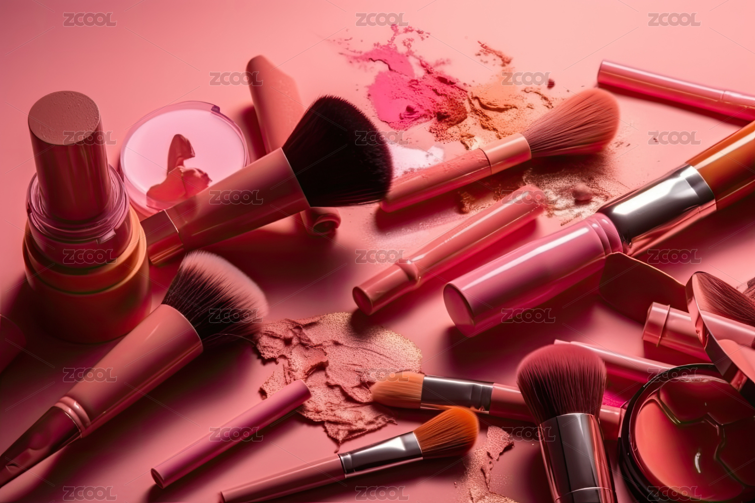 随意摆放的化妆品与化妆刷组合