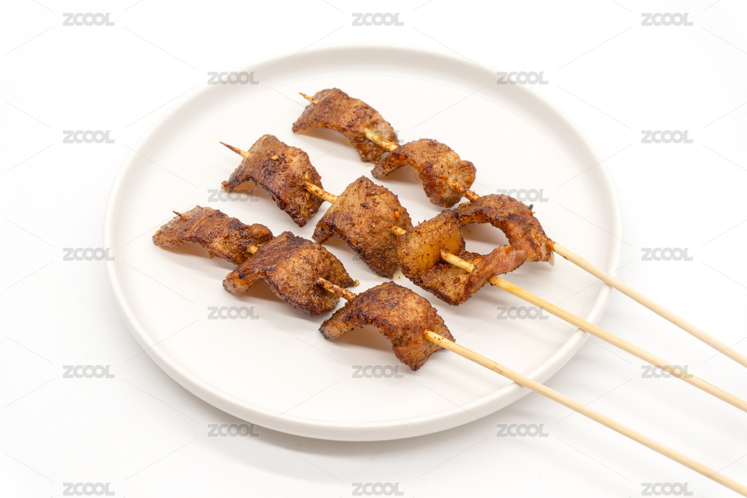 烤牛肉串,牛肉串,芝麻,烤串,竹签,蓝花瓷盘,特写,烤串摆盘