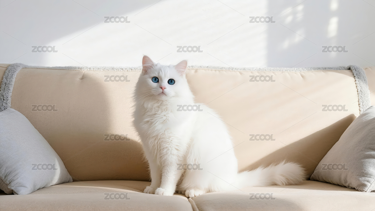 猫,白猫,蓝眼睛,宠物,沙发,家猫,萌宠,坐姿,室内,阳光