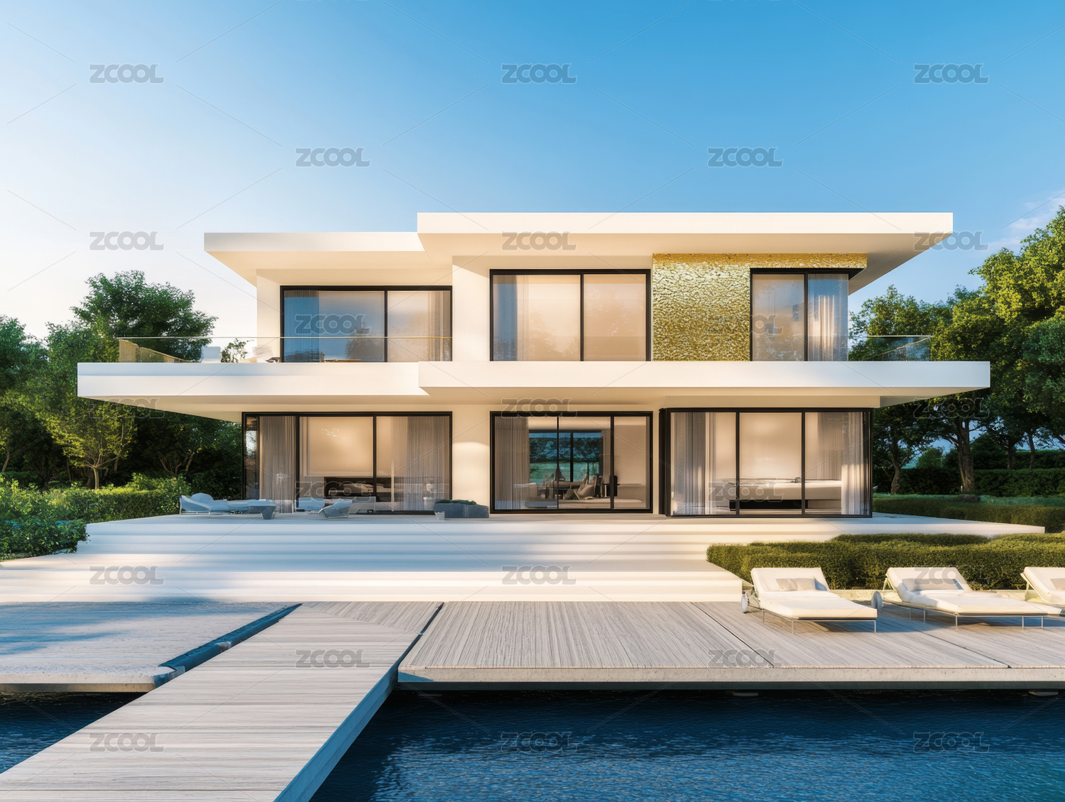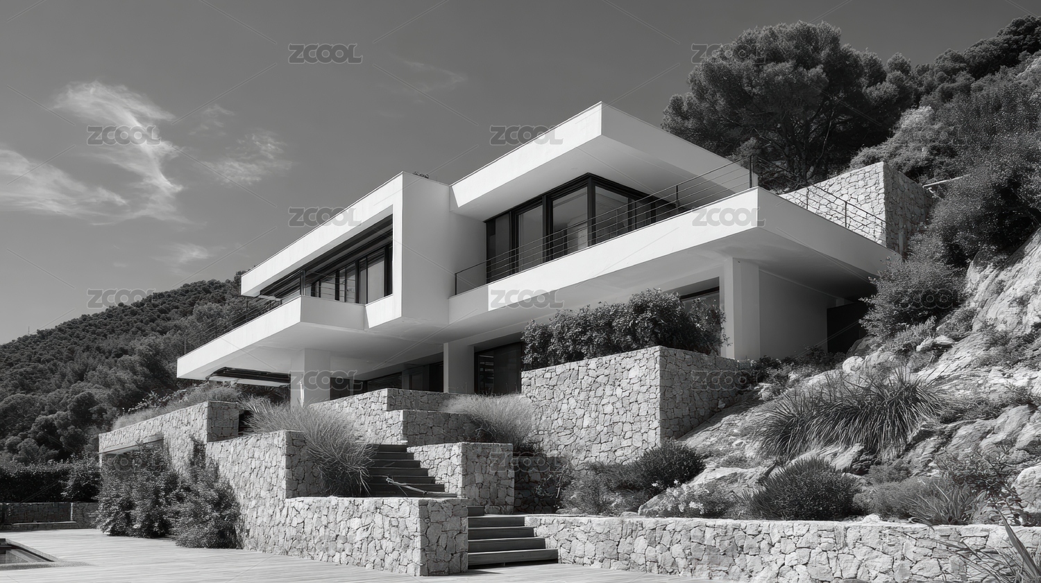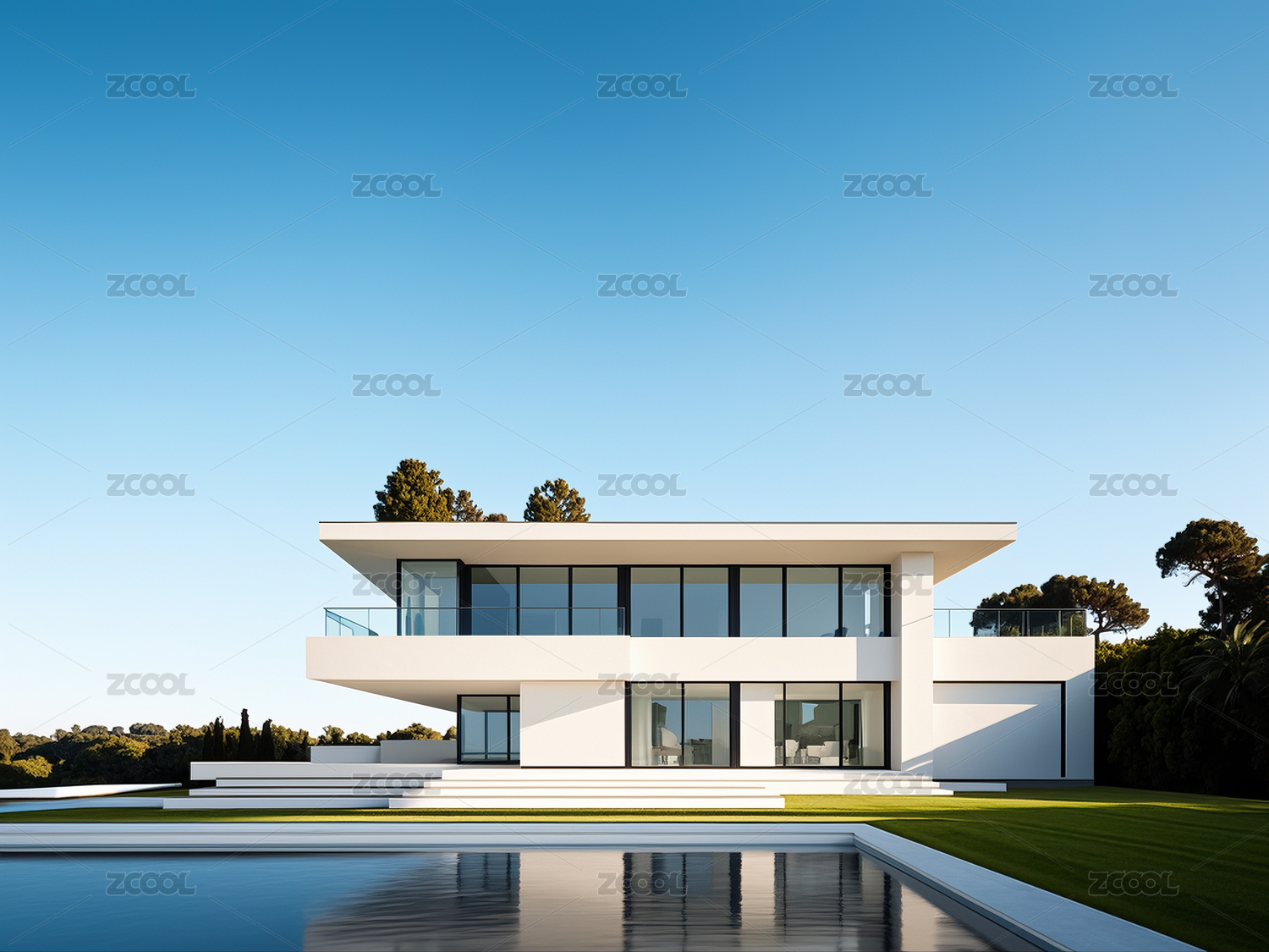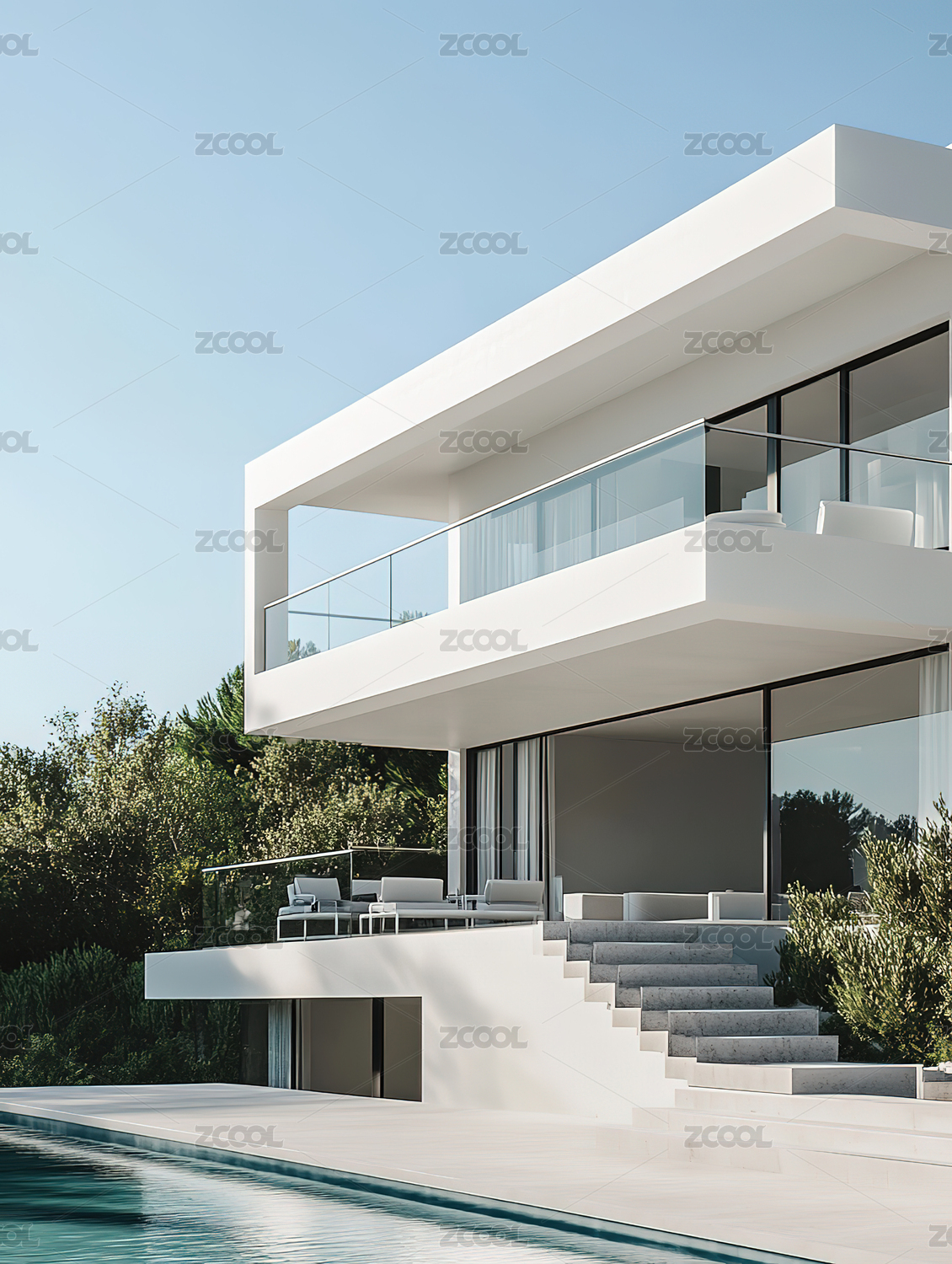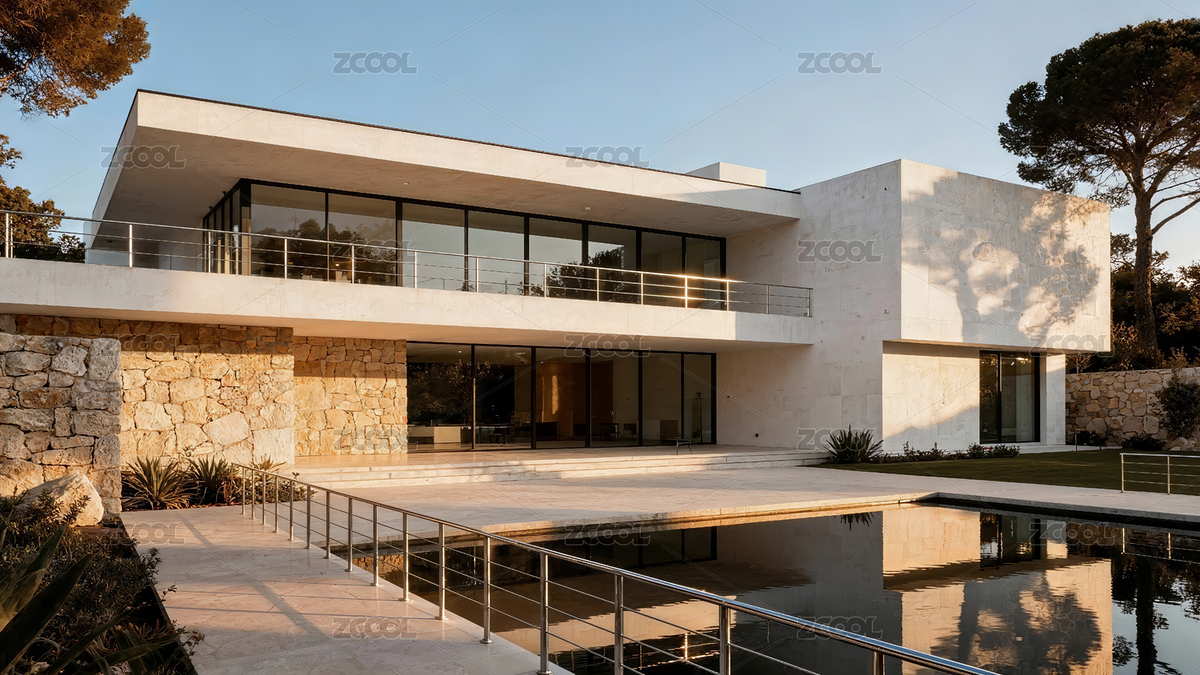 现代,别墅,建筑,外观,玻璃幕墙,泳池,庭院,住宅,户外空间,石材墙面