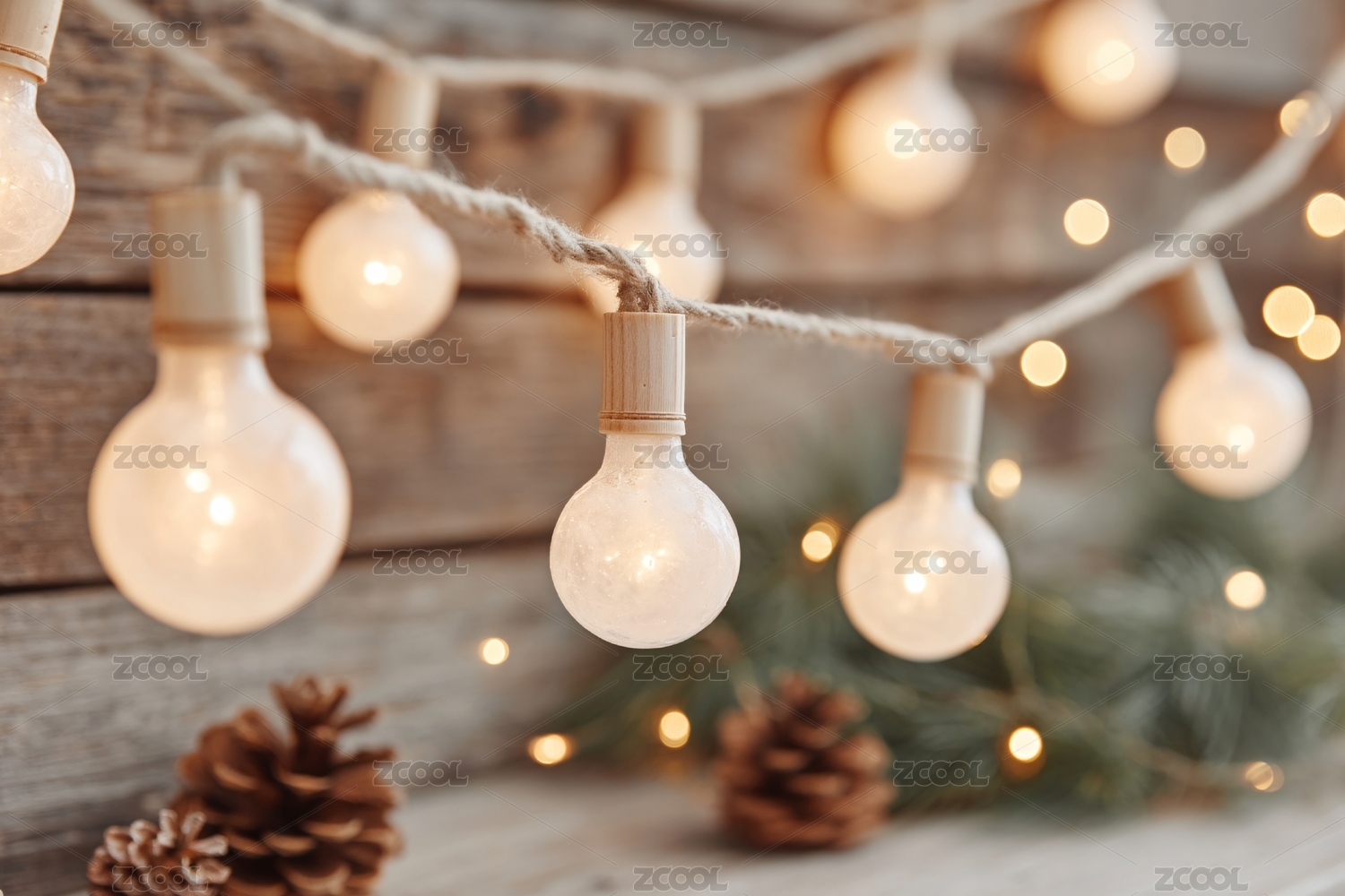 温馨木质背景的灯泡串装饰