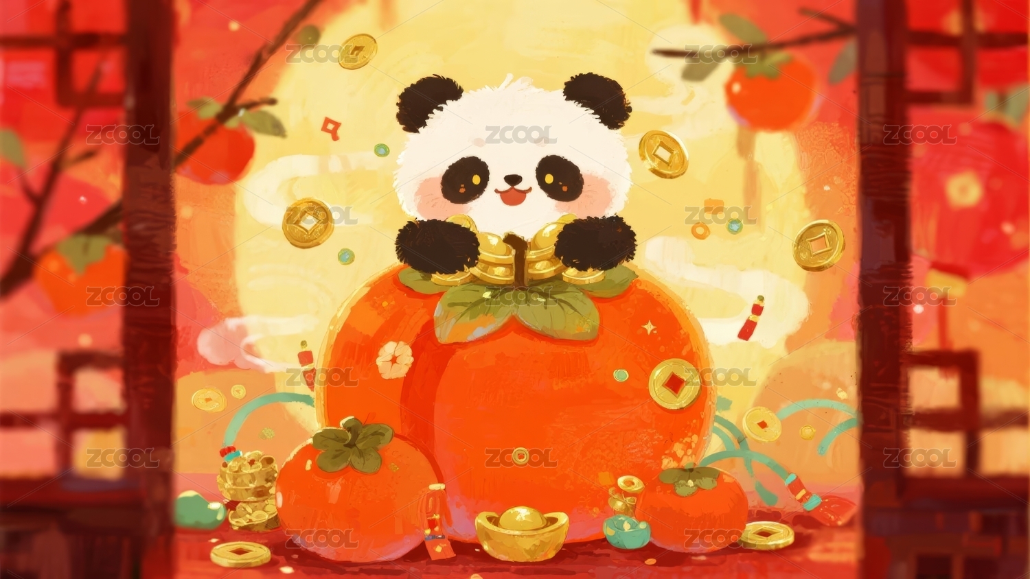 熊猫,财神,帽子,服饰,红色,绿色,橙色,橘子,果树,灯笼