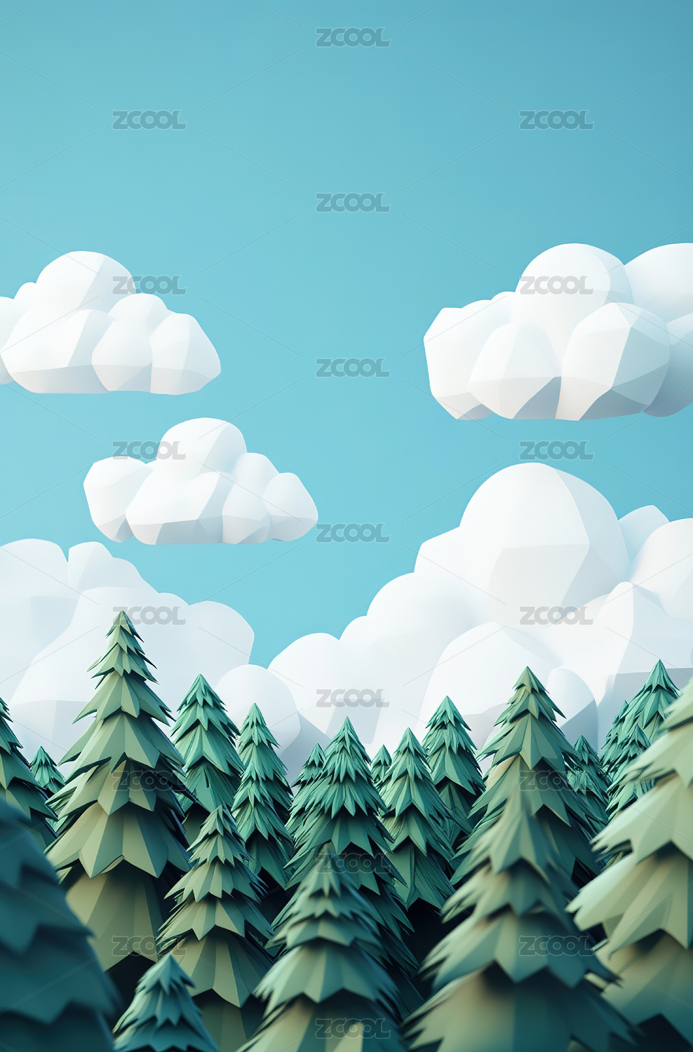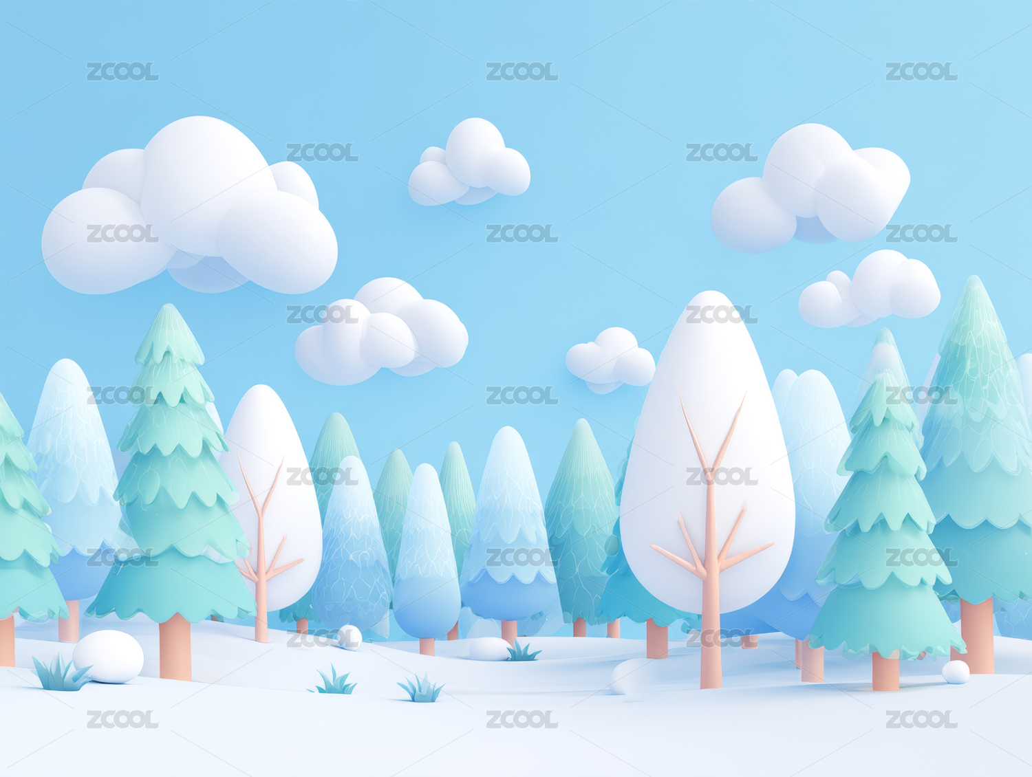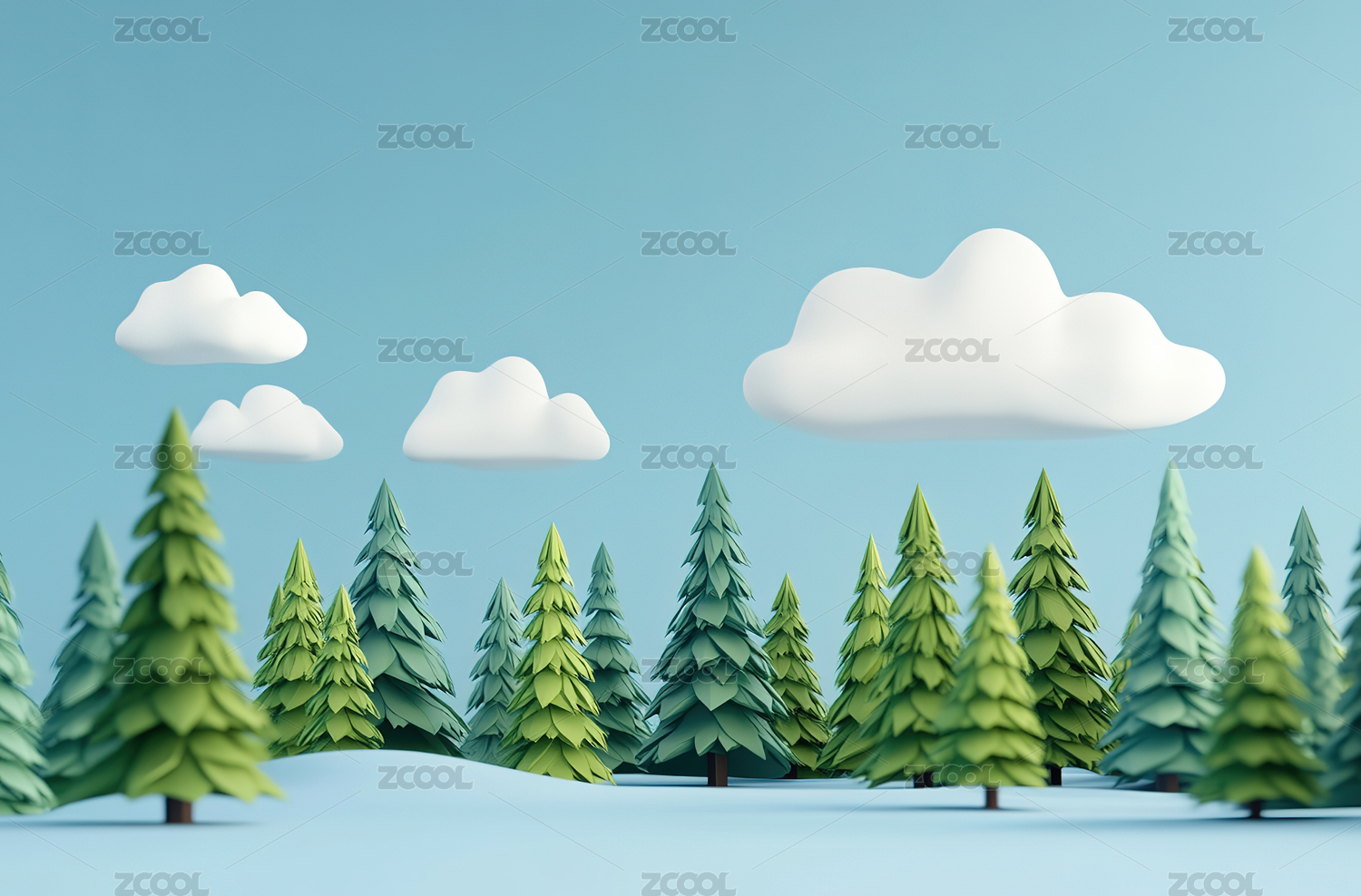 松树,云朵,冬天,蓝色,雪景,森林,3D,童话,清新,自然