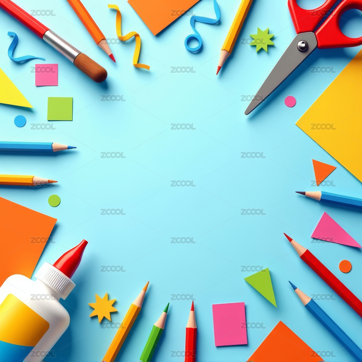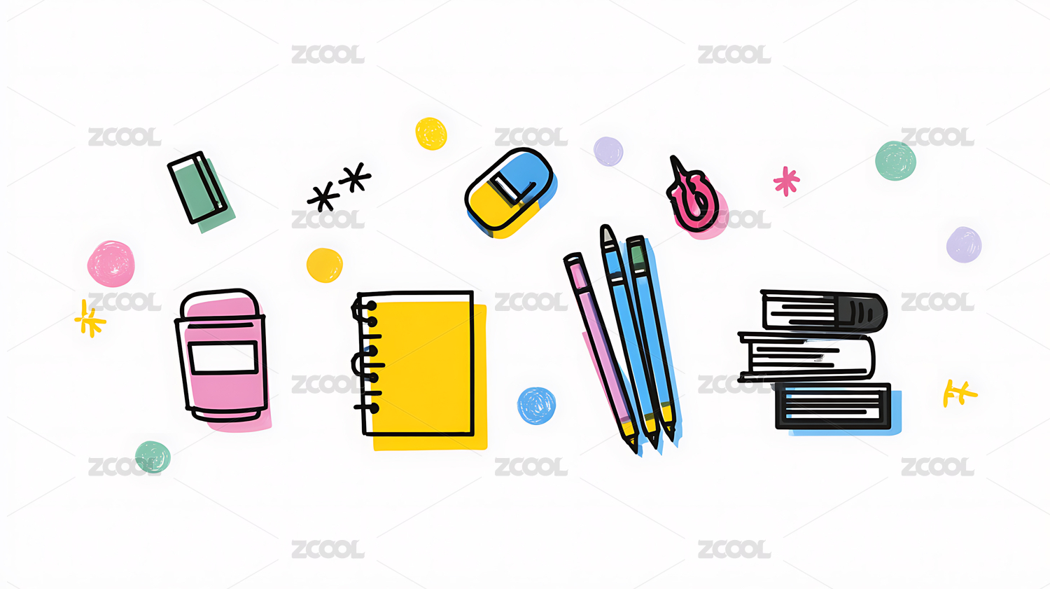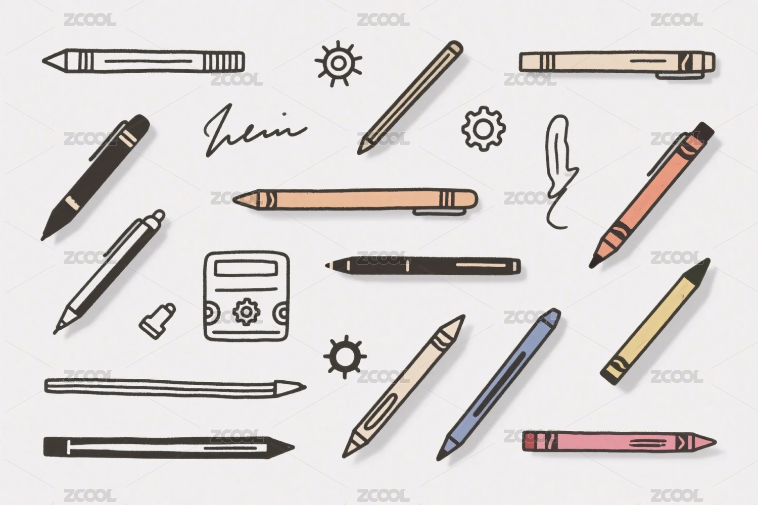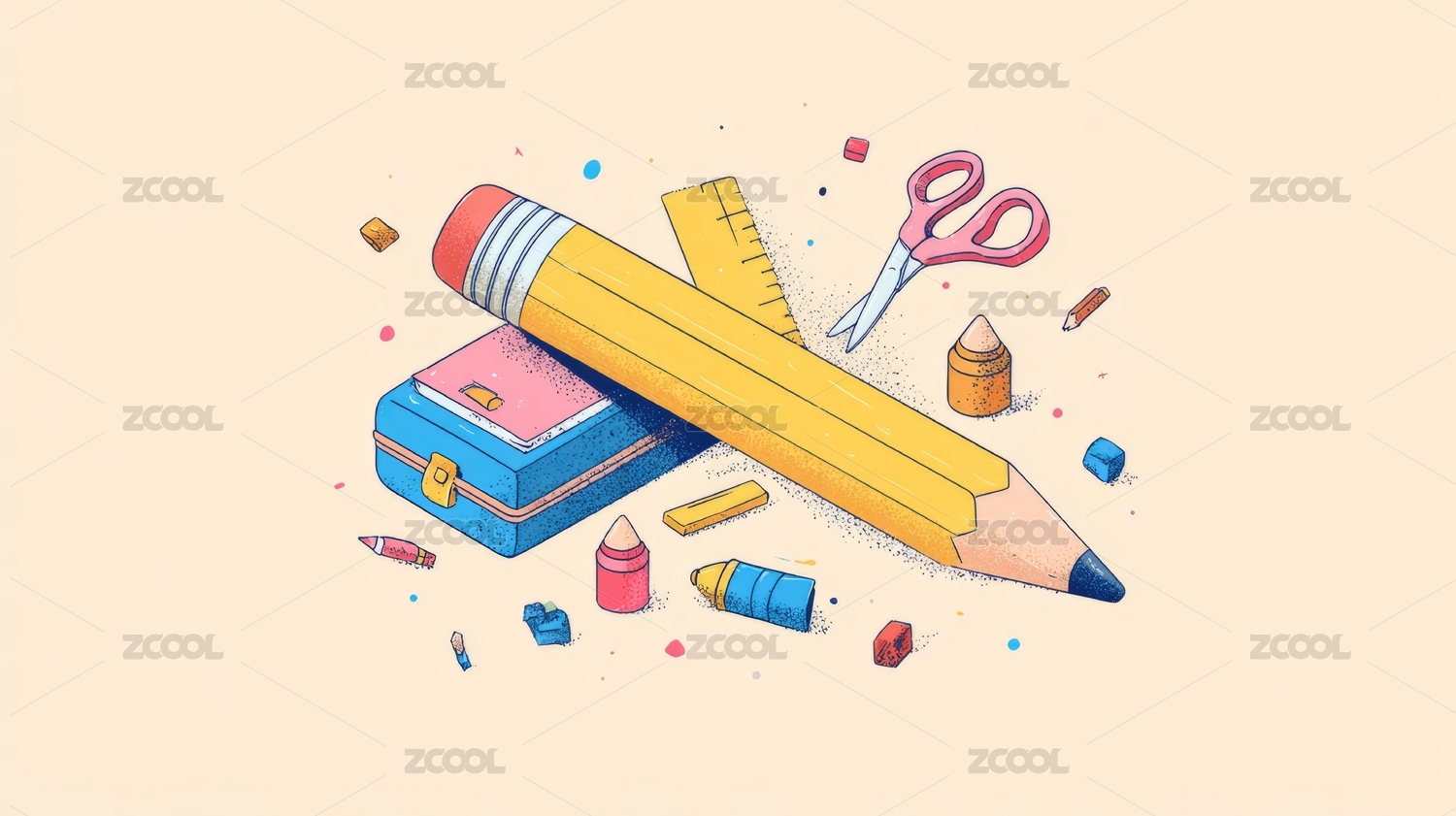 铅笔,尺子,剪刀,订书机,回形针,彩色铅笔,荧光笔,学习工具,文具,插画