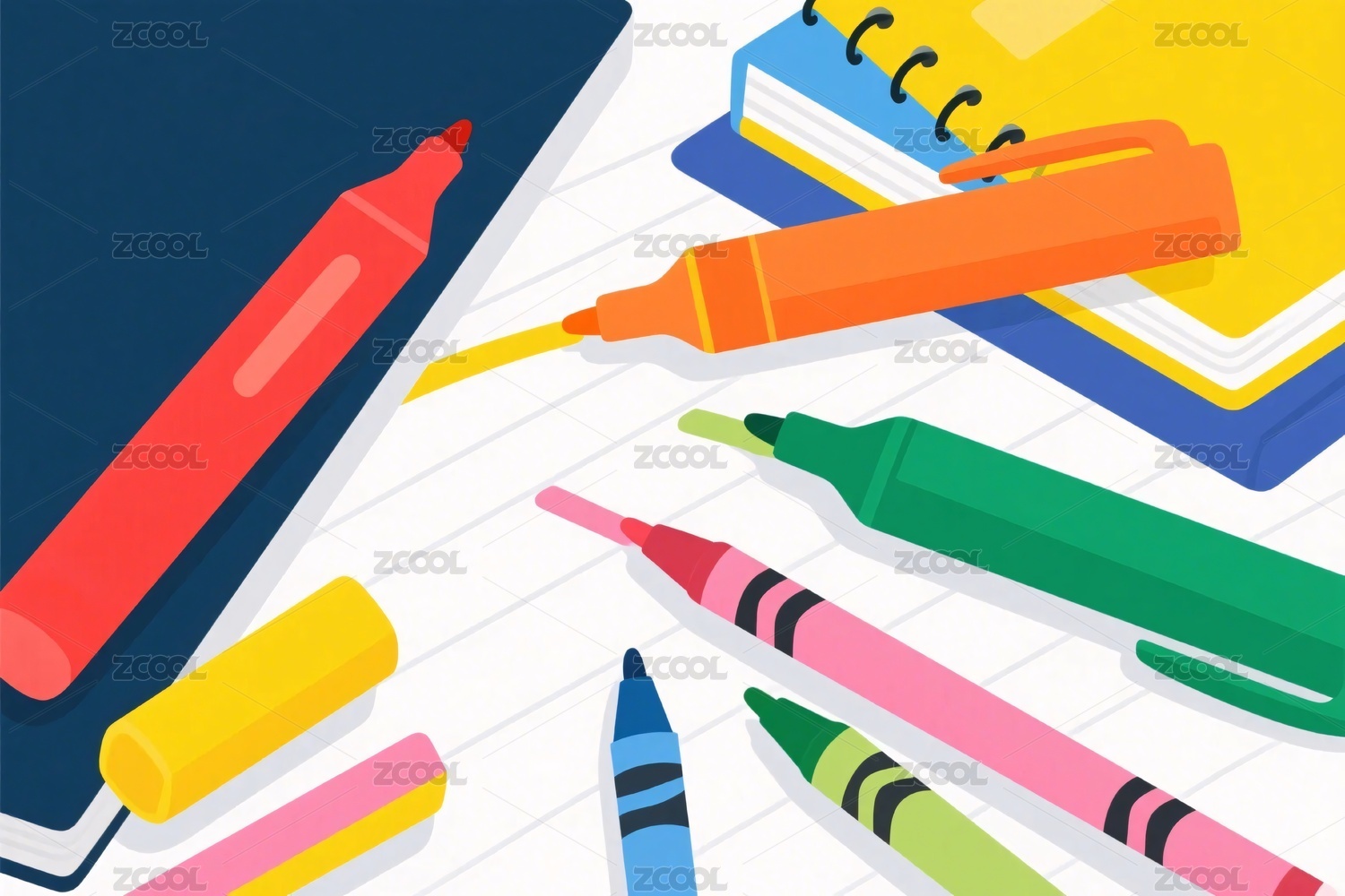 学习用品,文具,铅笔,铅笔盒,彩色铅笔,笔记本,橙色背景,插画,教育,工具