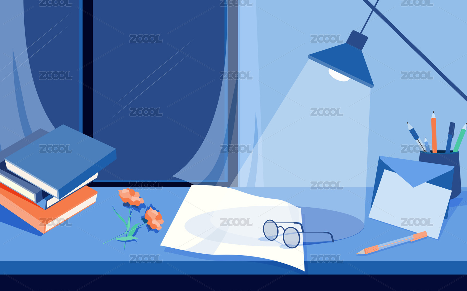 办公桌上的电脑和台灯插画