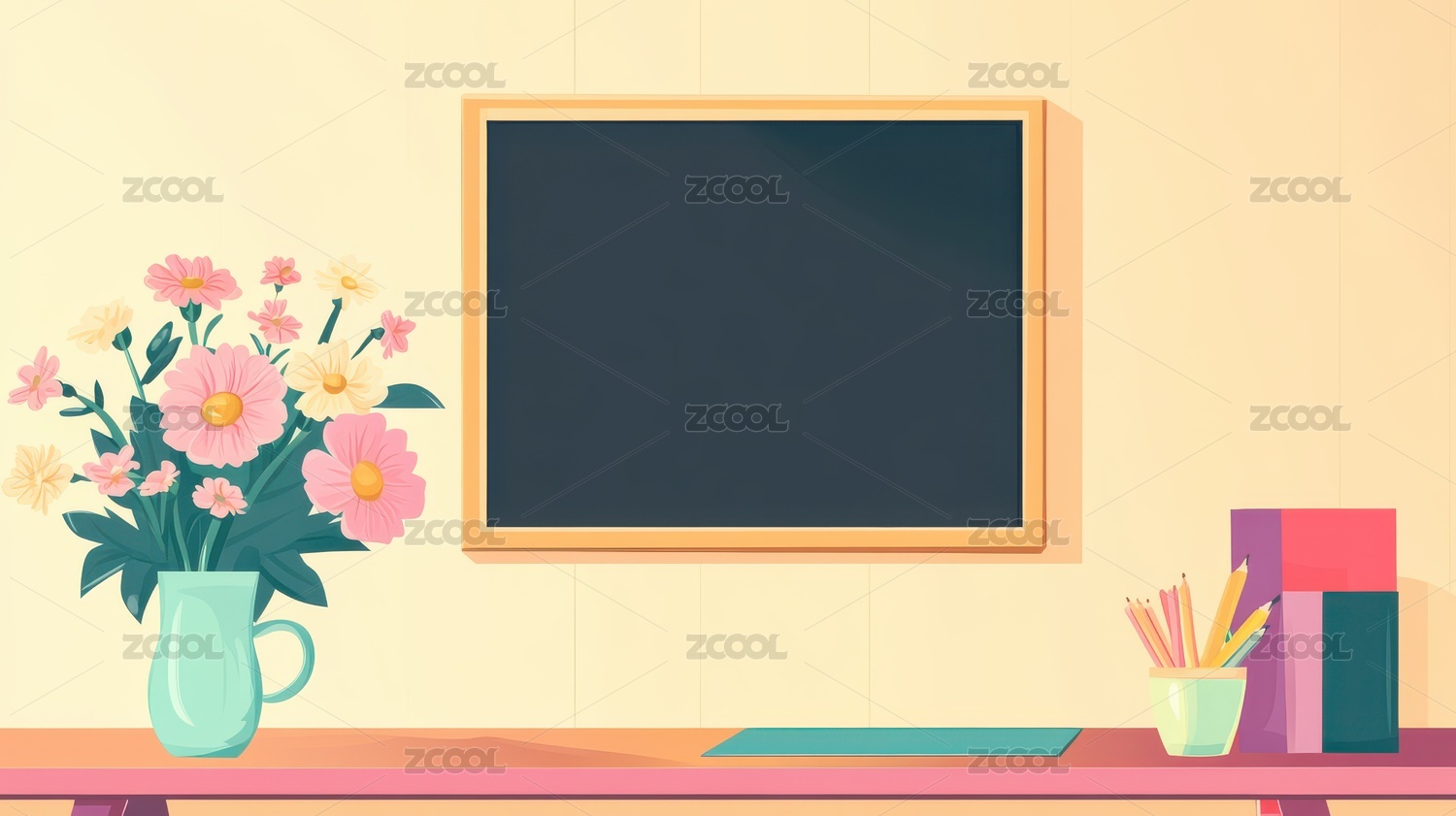 教室前的黑板与鲜花装点的桌面小景
