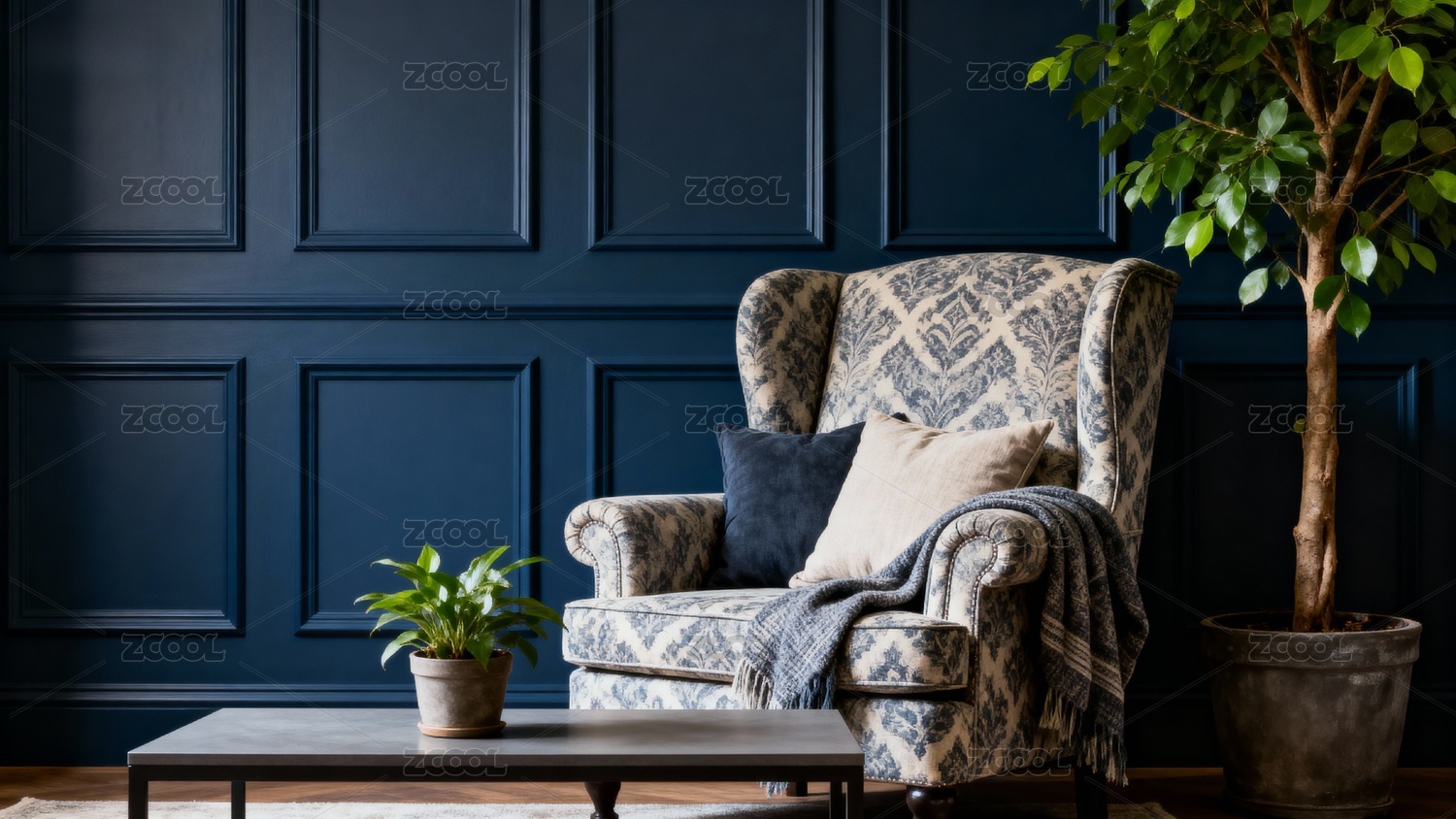 室内,装饰,蓝色,椅子,植物,家居,客厅,抱枕,茶几,毯子