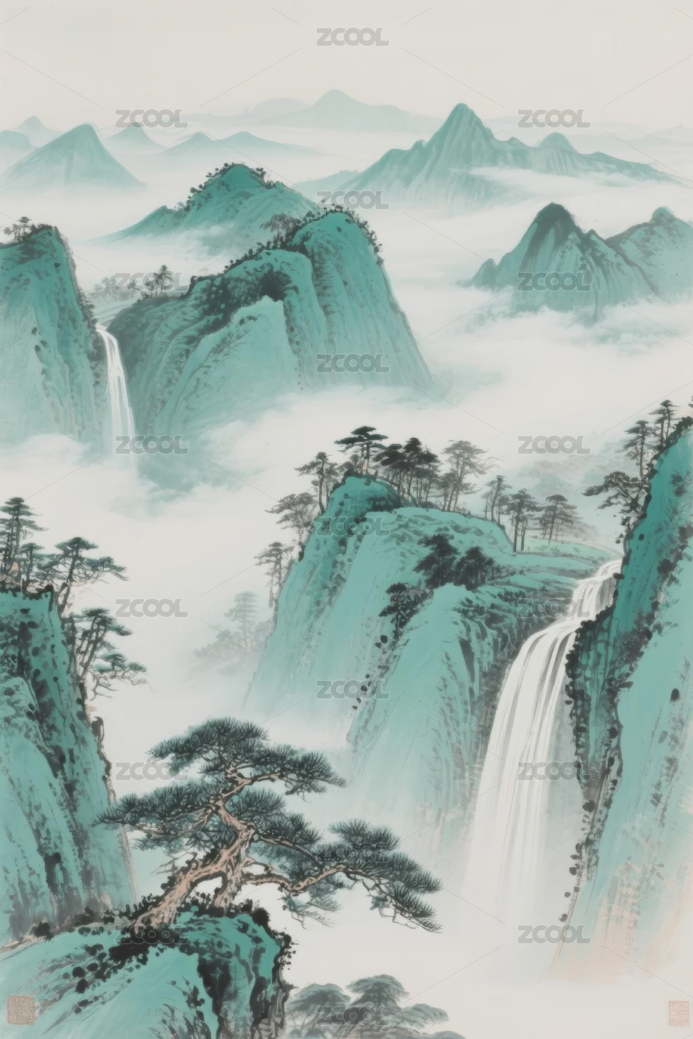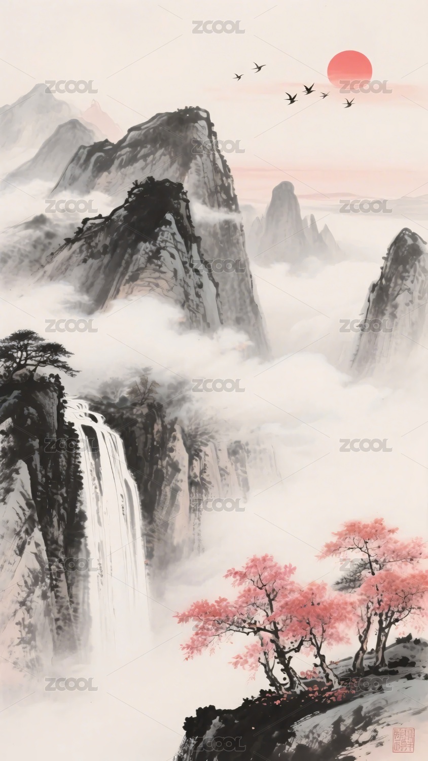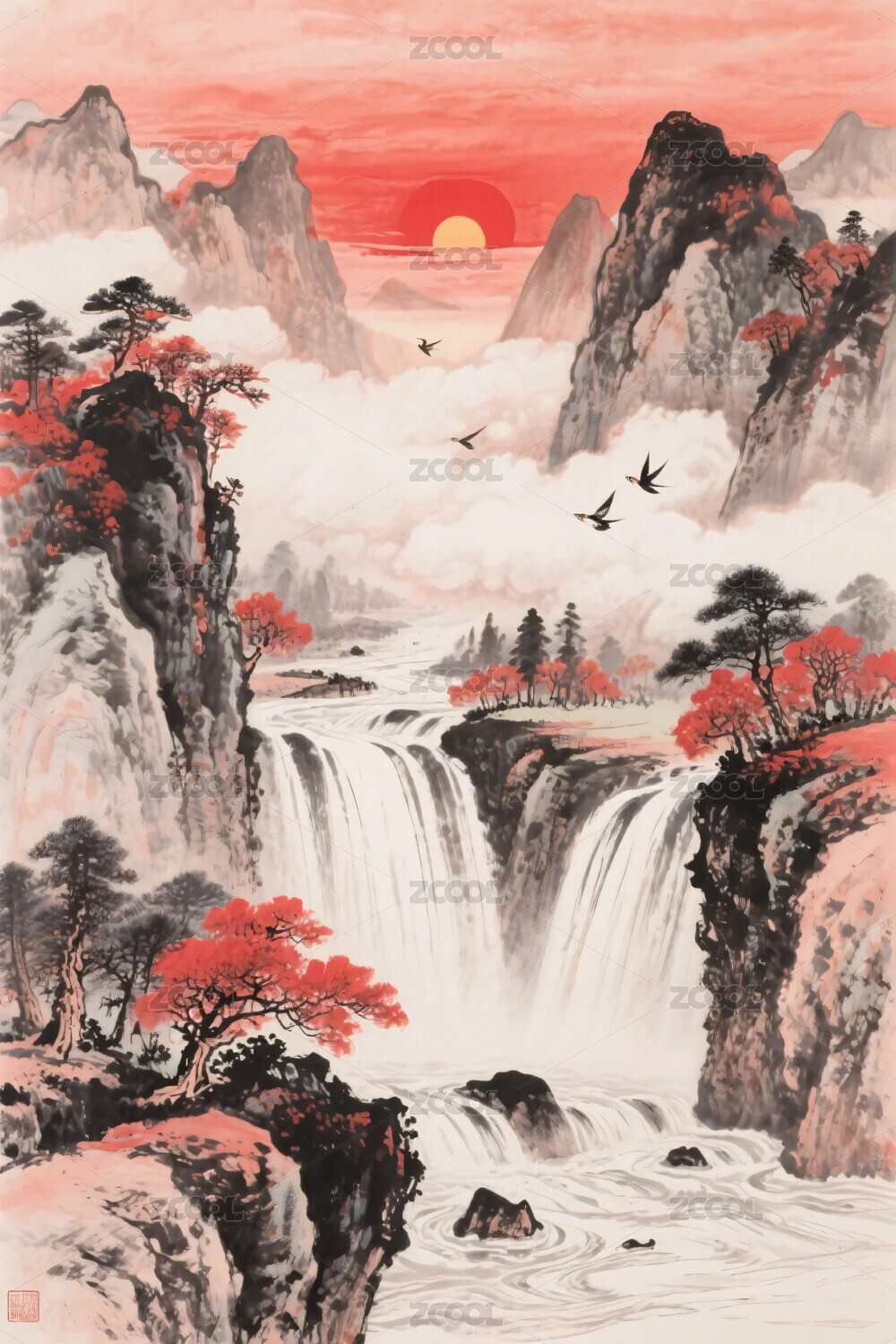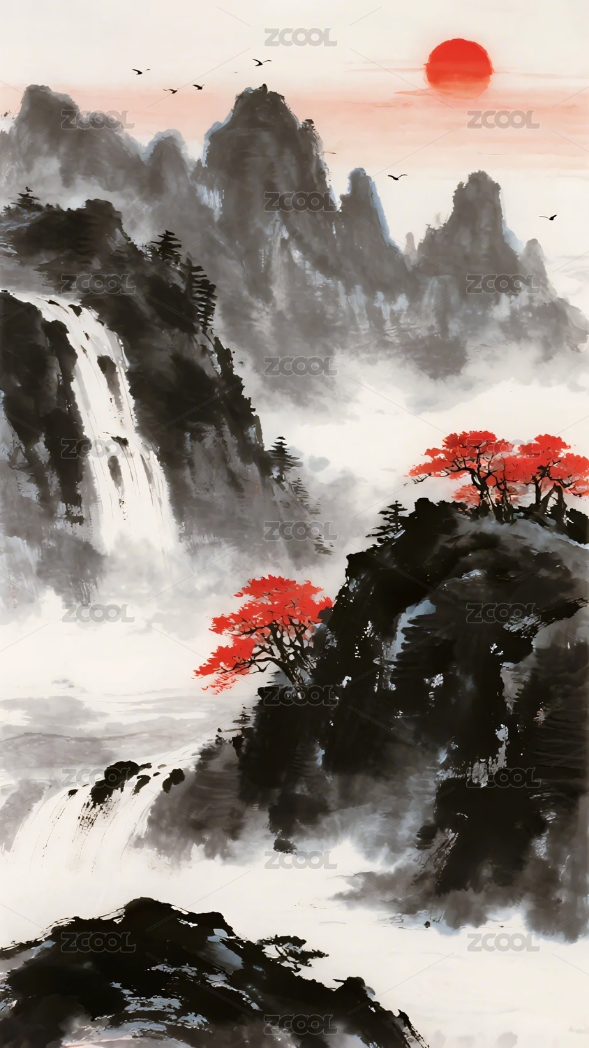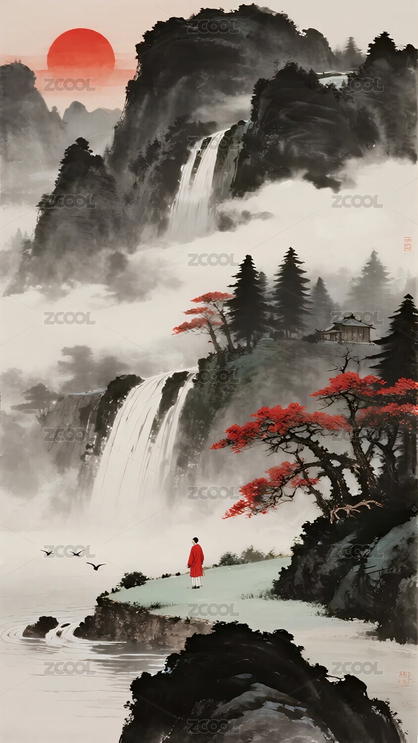 山水,风景,山水画,水墨画,山水水墨,山水插画,红色山水,山水云雾,传统水墨,插画