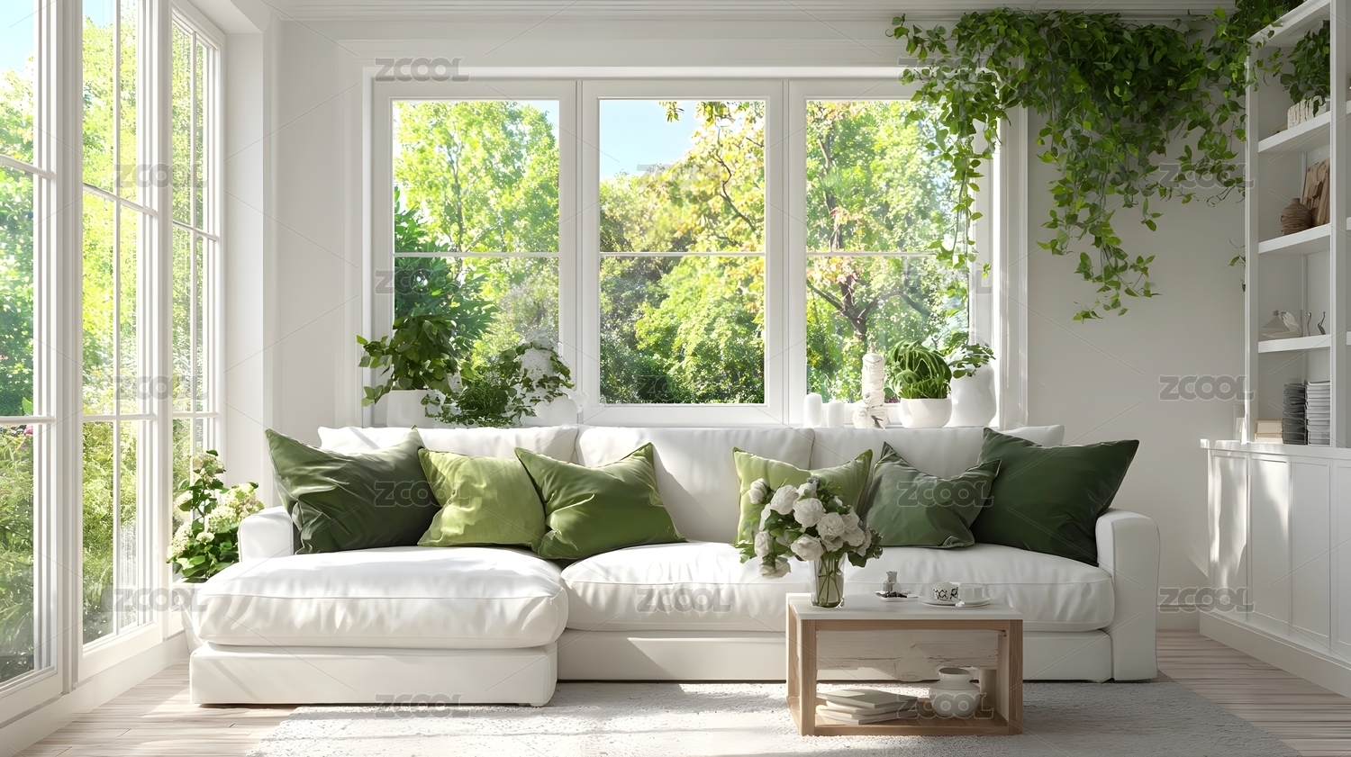 大窗绿植旁白色沙发配绿抱枕的客厅