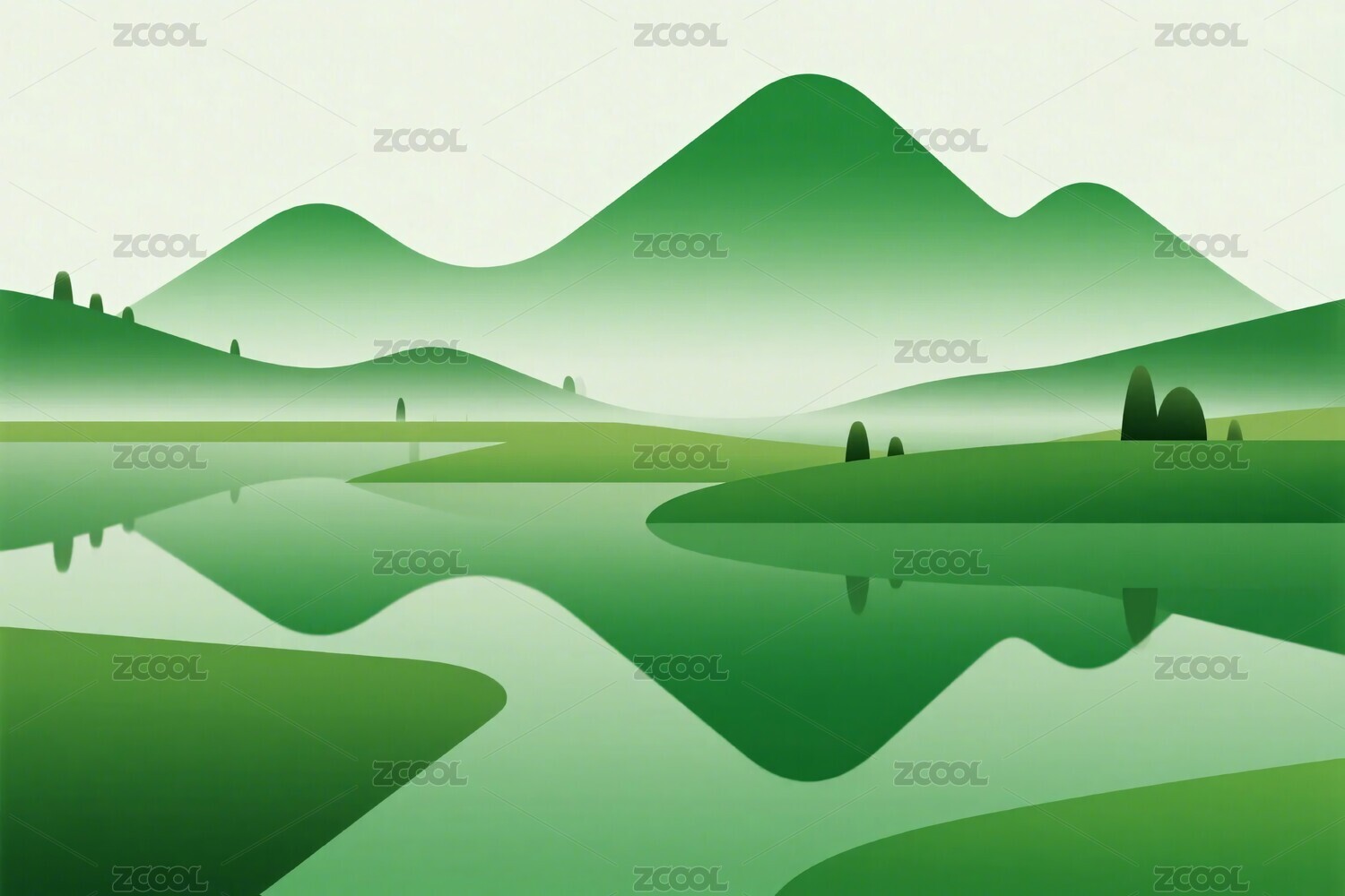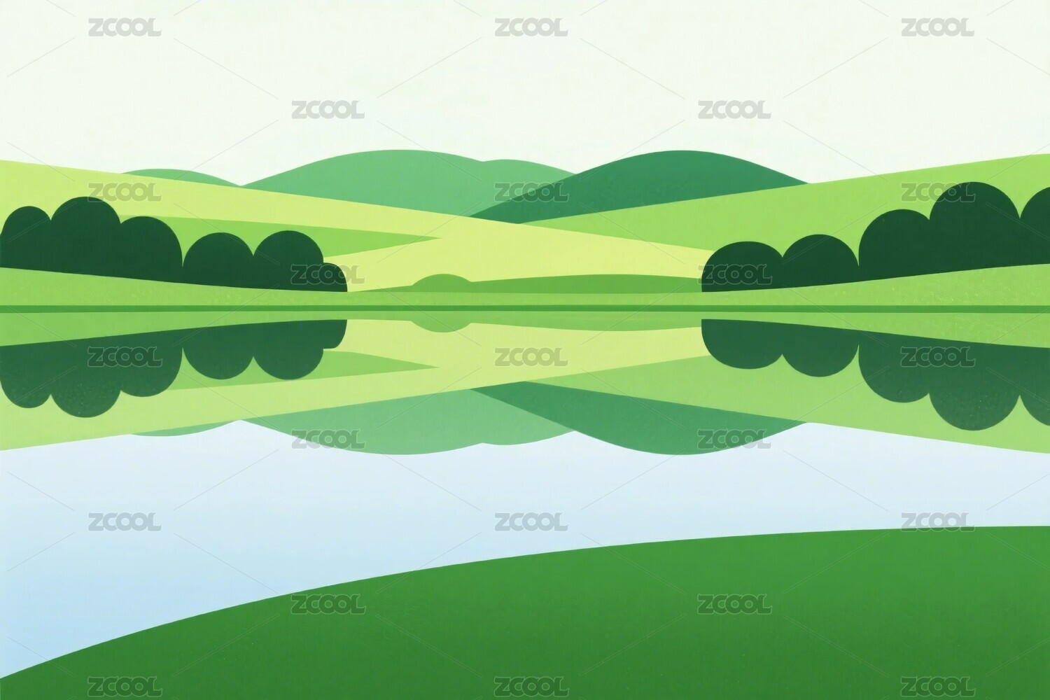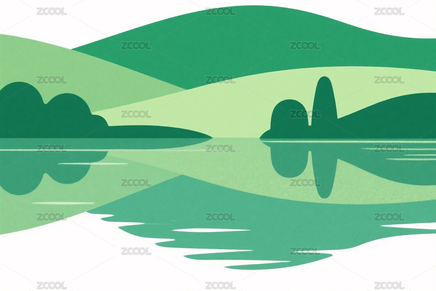 山水,风景,自然,插画,扁平,简约,绿色,山丘,湖泊,倒影