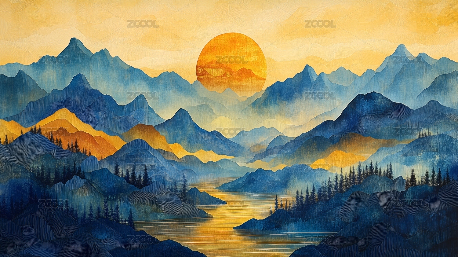 数码艺术描金蓝调日出山水画海报背景