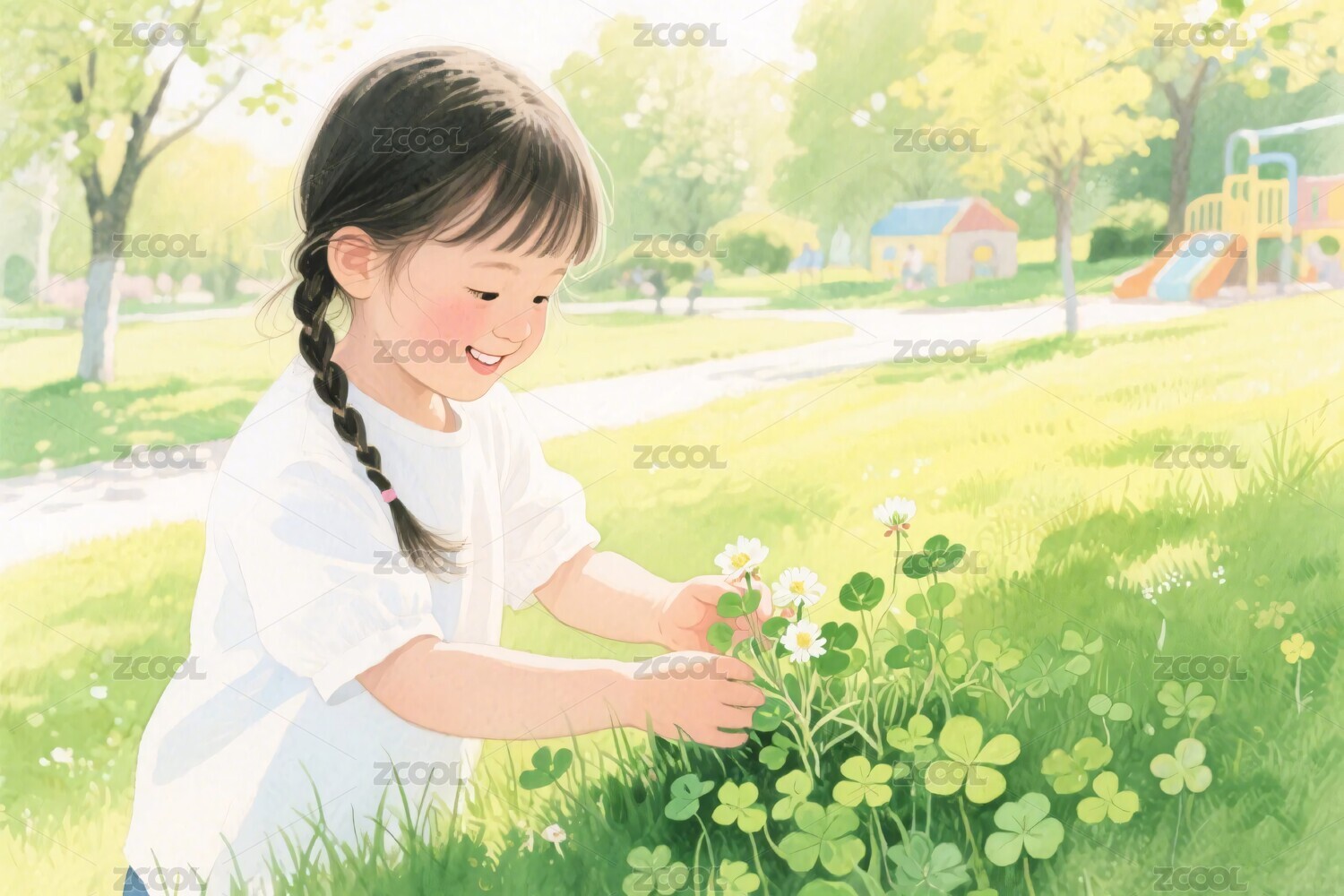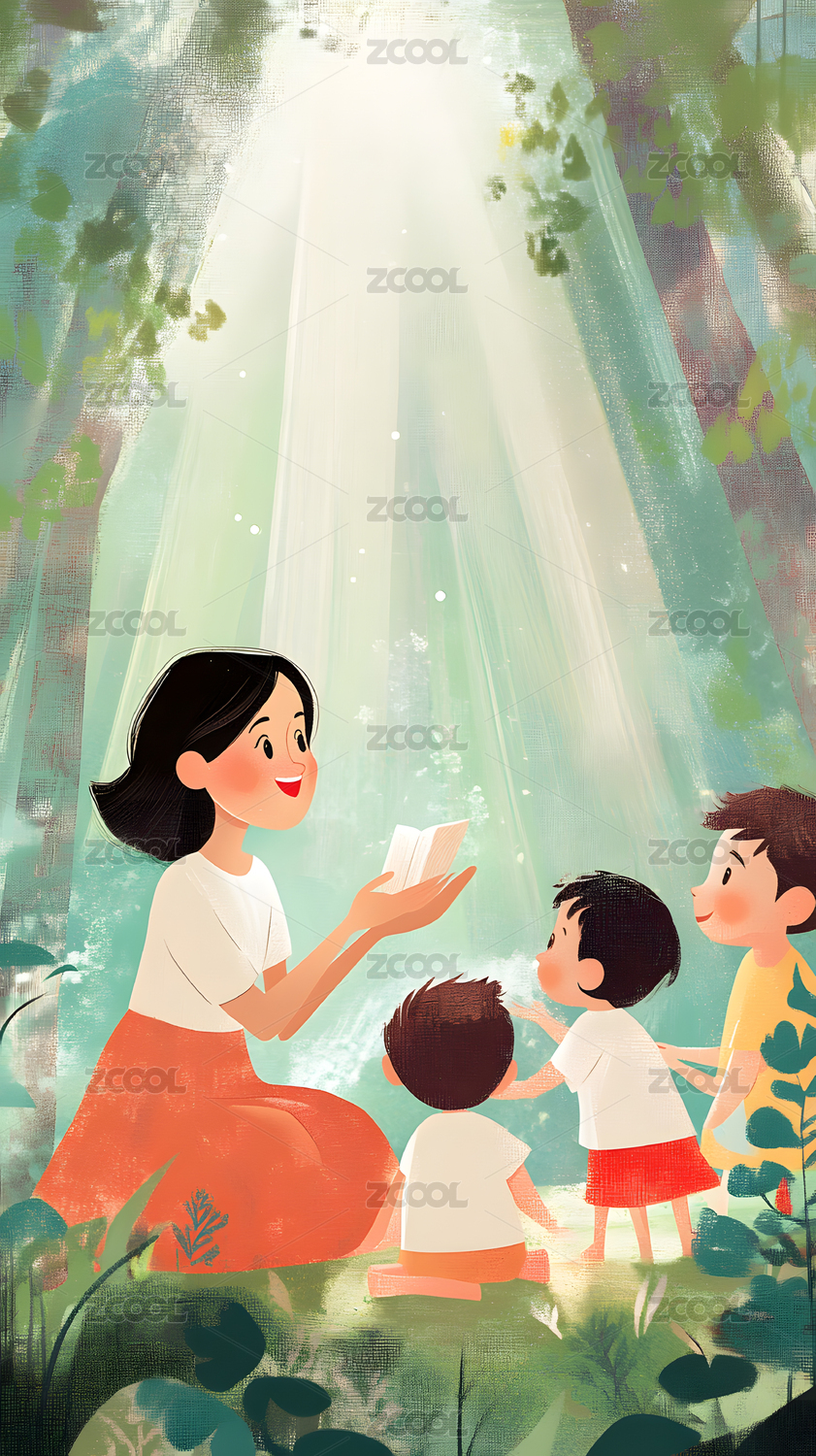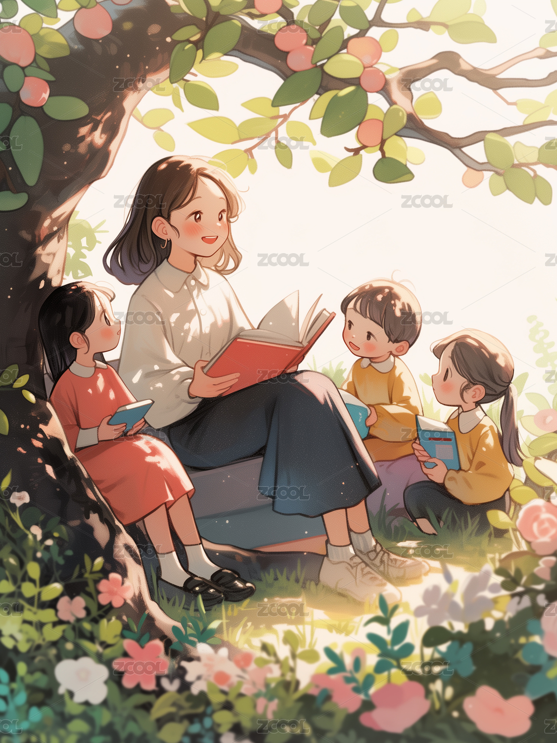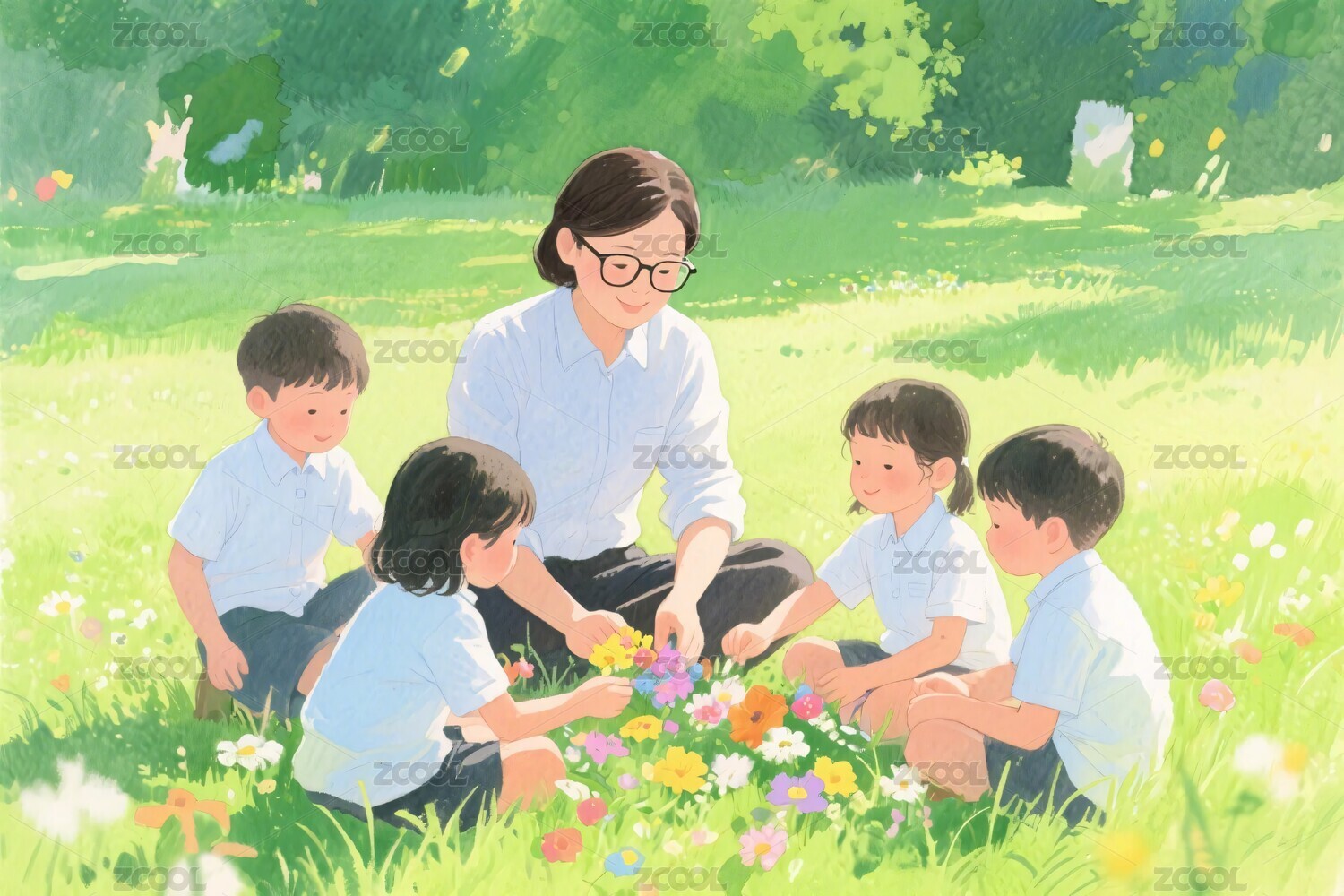 老师,小朋友,草地,花朵,画具,教育,插画,手绘,户外,课堂