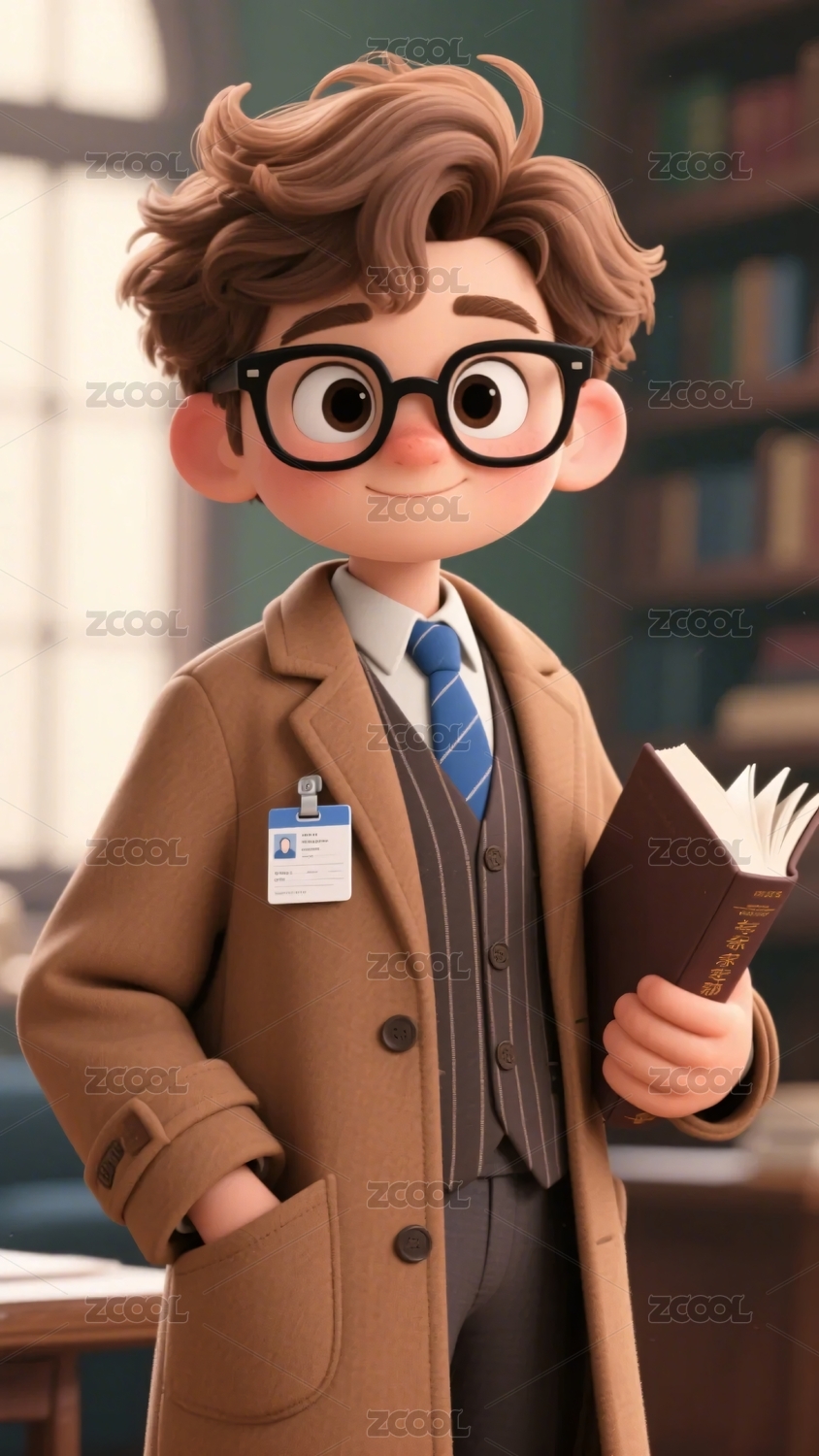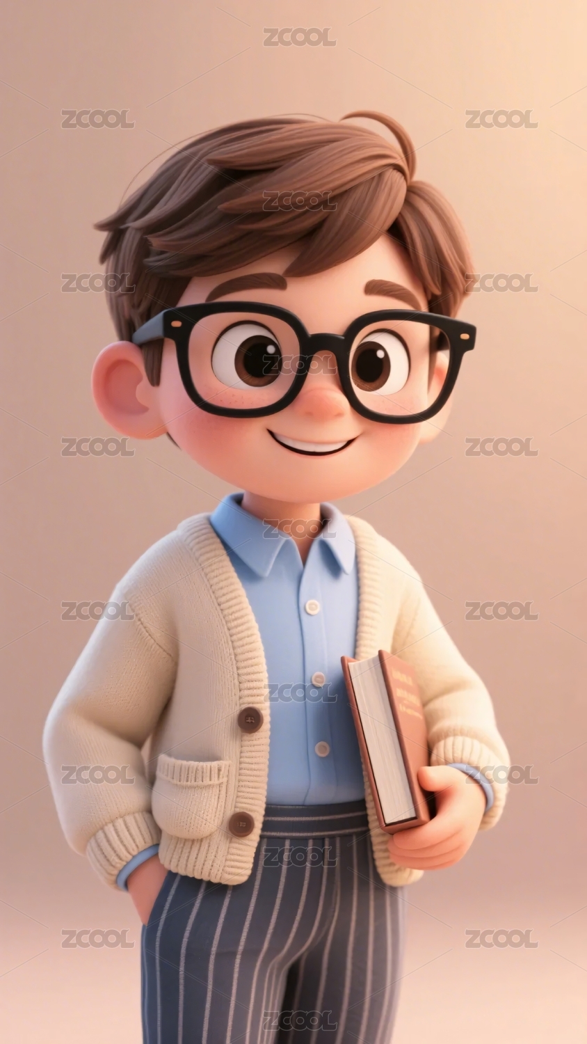 清新可爱拿着书的短发眼镜男孩3D立体插画
