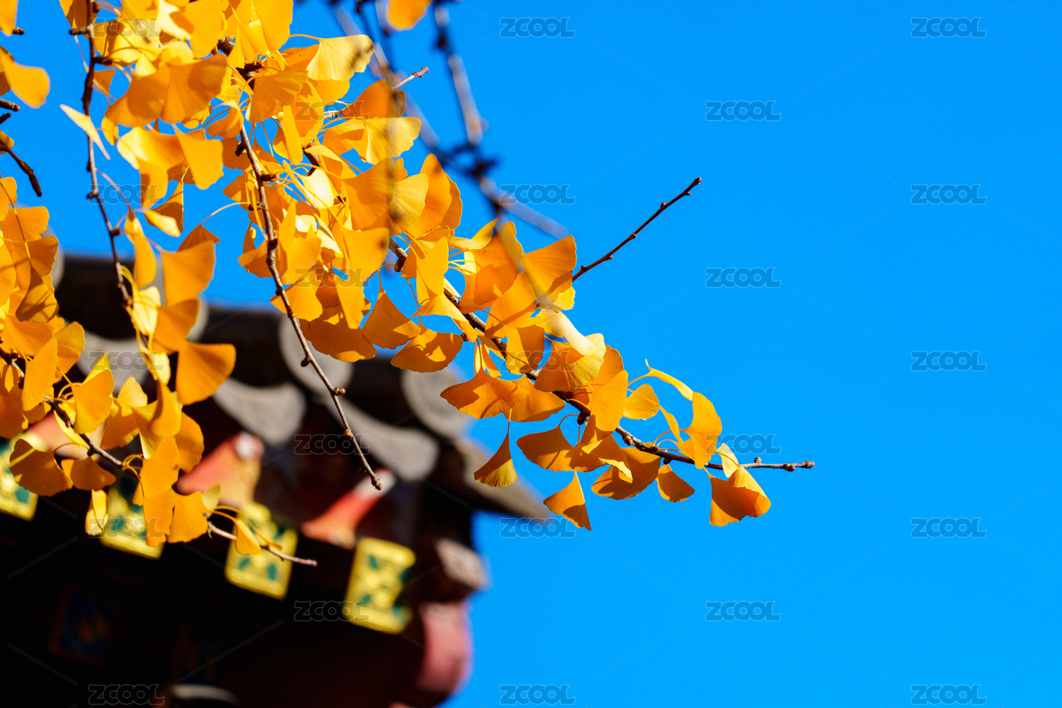 秋日蓝天下的金色银杏树叶与中国传统屋顶