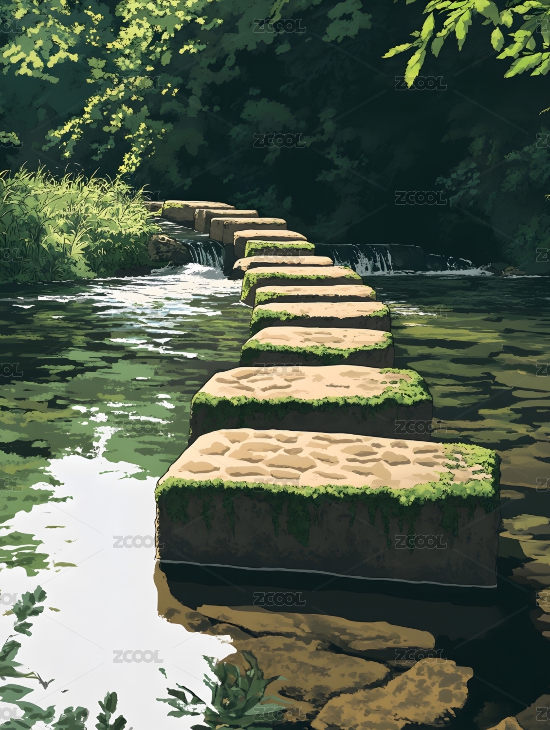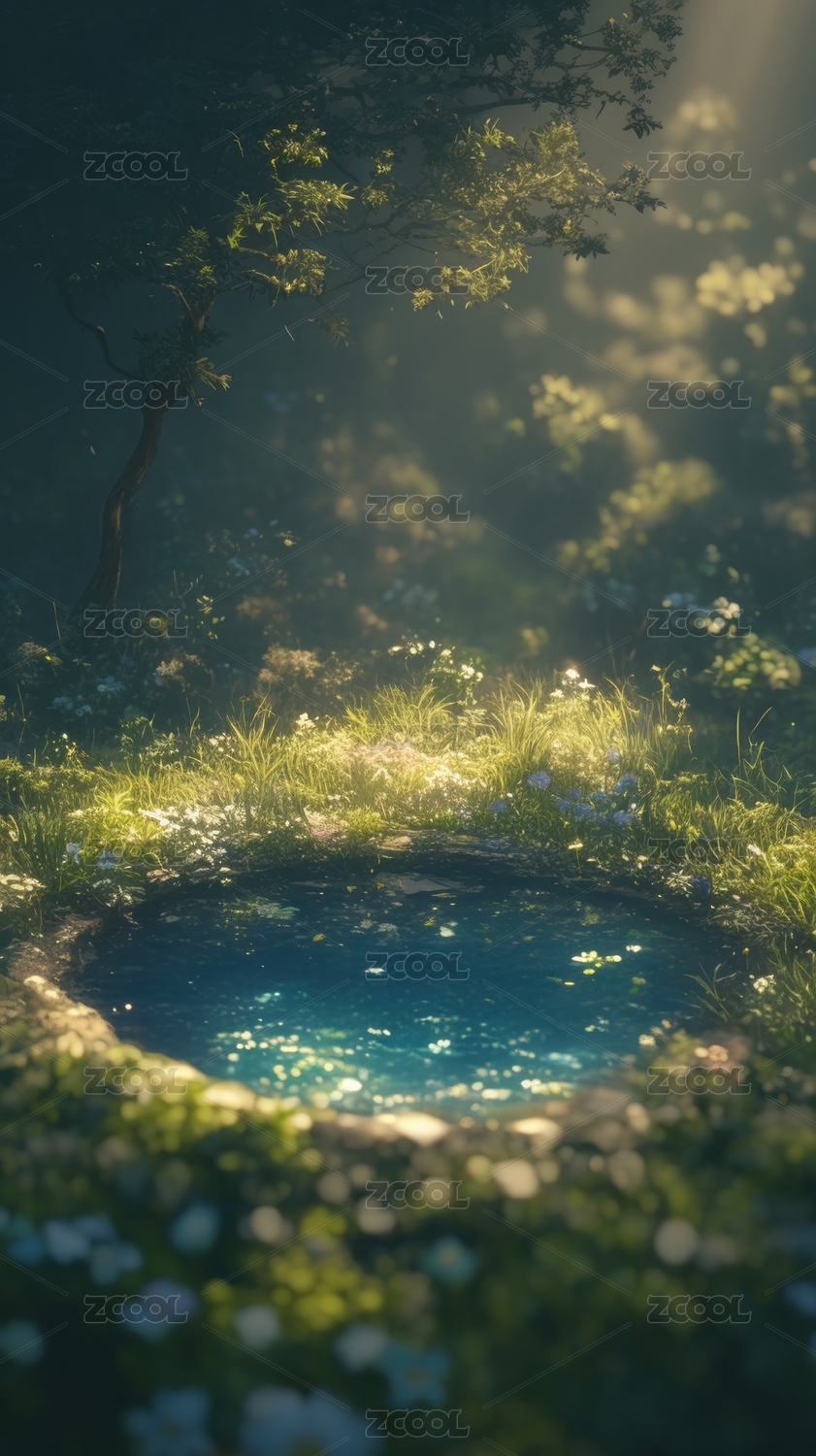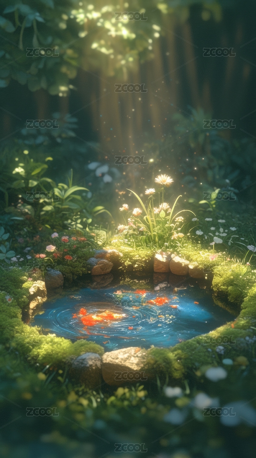 清新古朴湿地长满青苔古井水井3D卡通背景