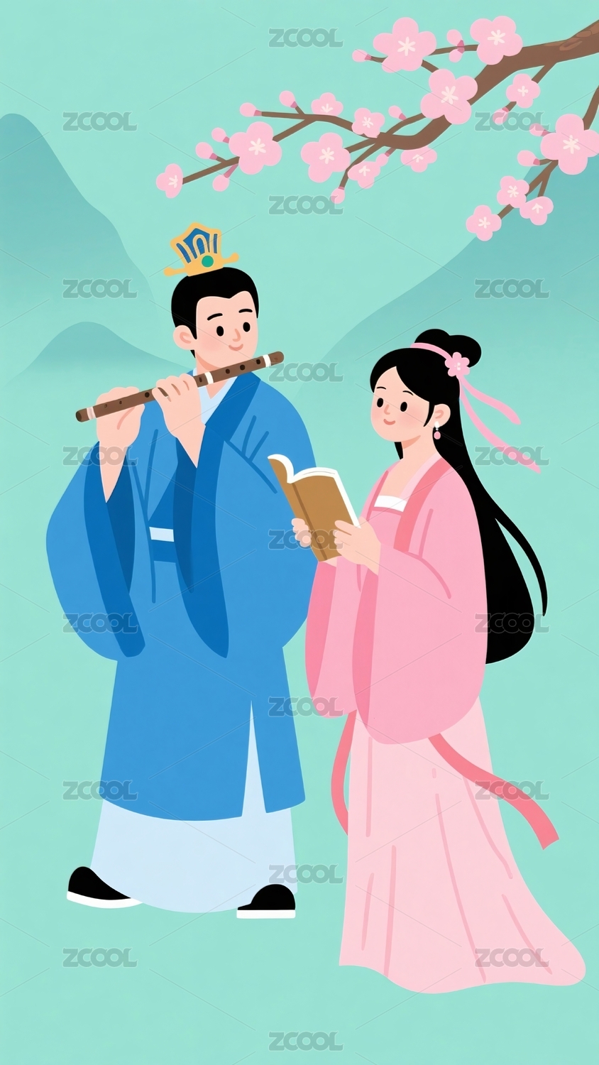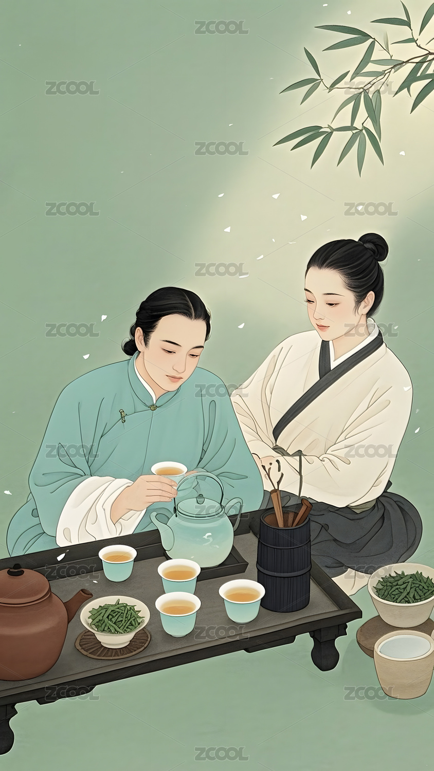 男女,对坐,亭台,饮茶,中式,传统,服饰,长袍,长裙,蓝绿