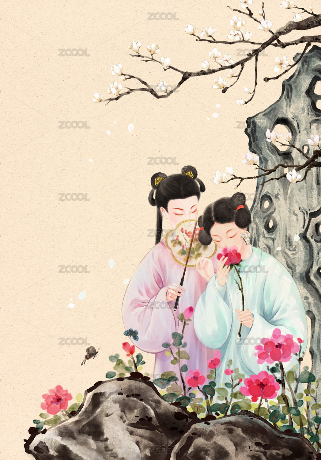 中式茶道古代古装仕女喝茶,宫墙角梅花盛开