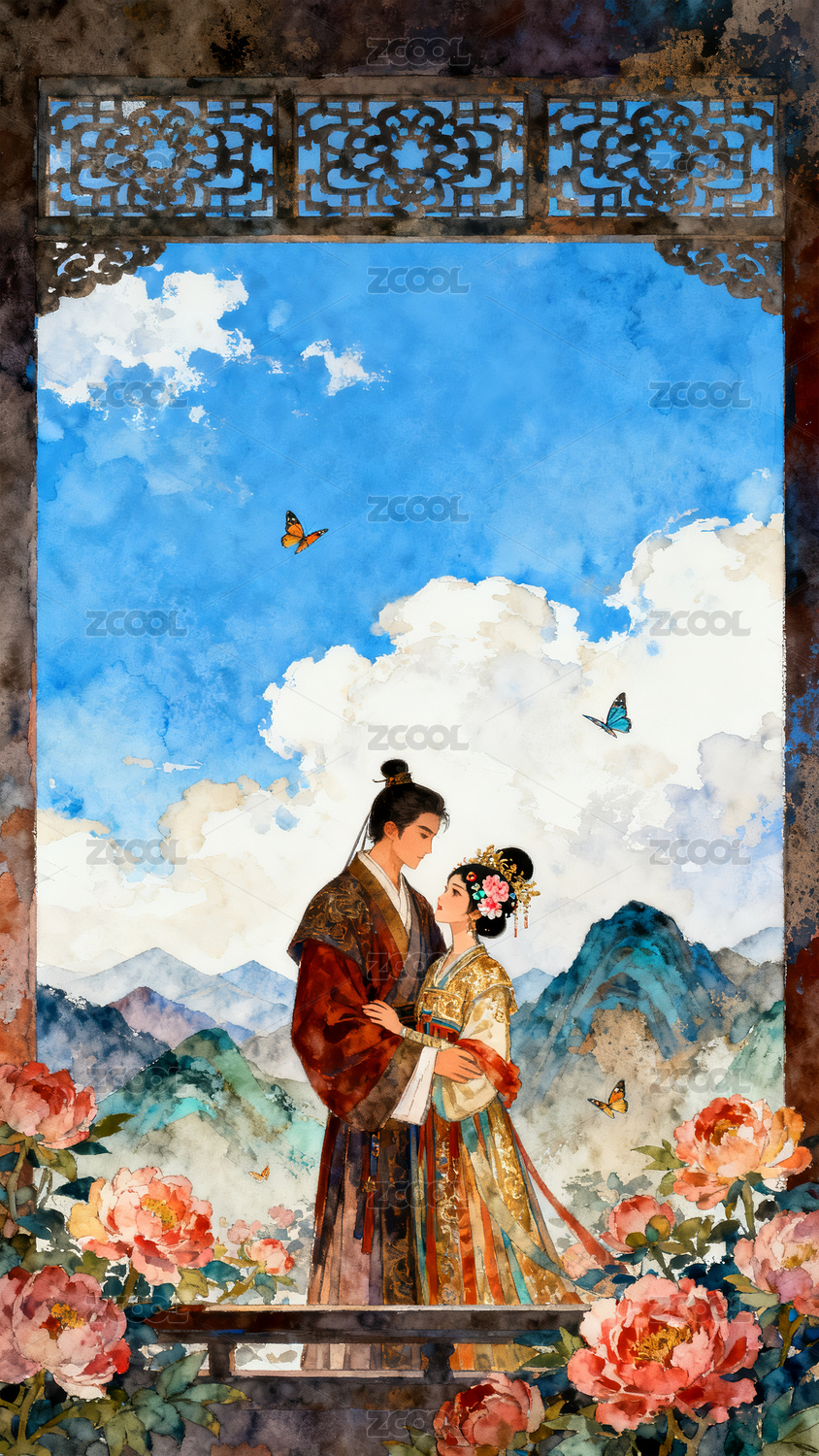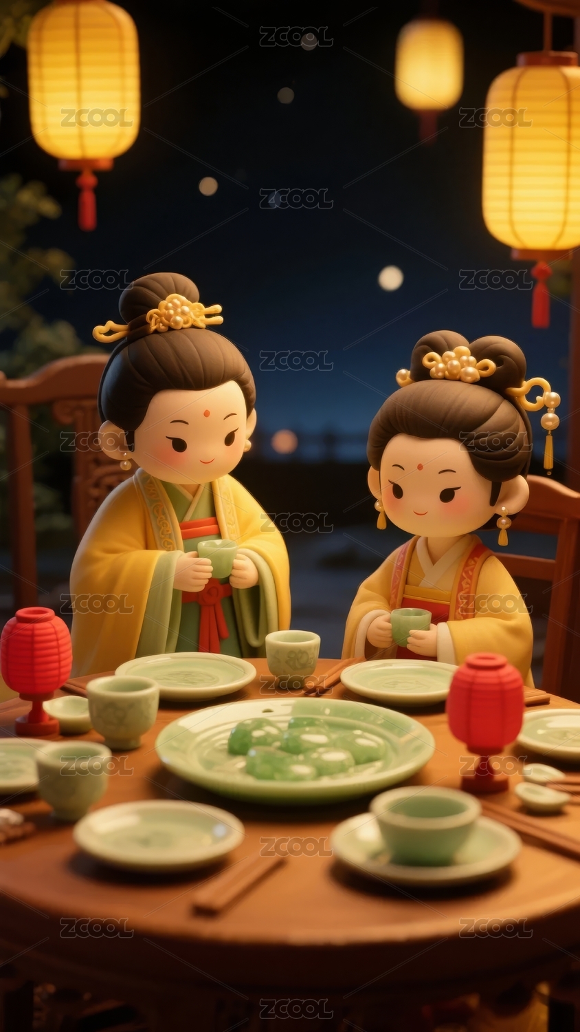 男女,对坐,亭台,饮茶,中式,传统,服饰,长袍,长裙,蓝绿