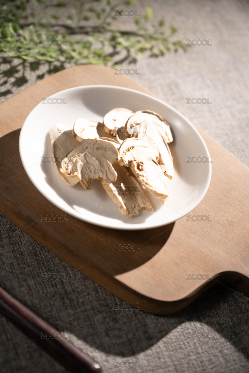 桌面上的盘子里的美味可口的干松茸
