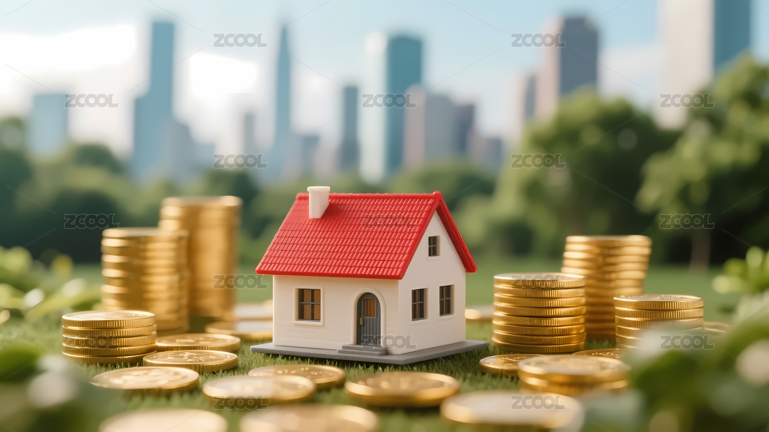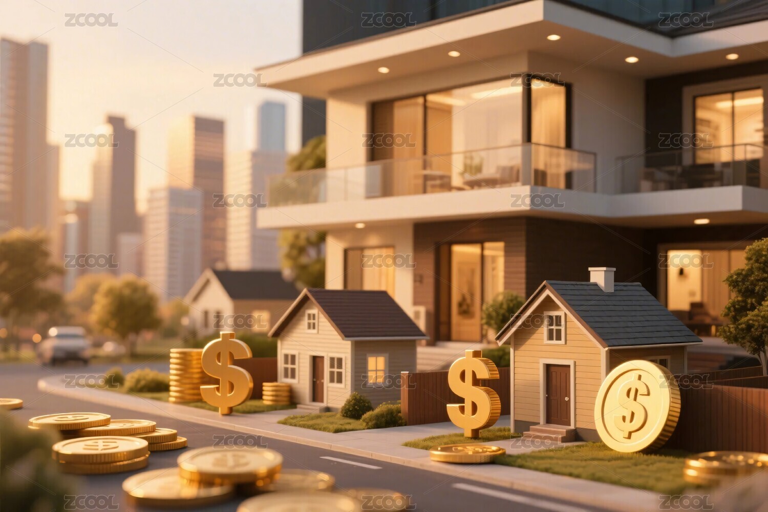 城市中带金钱元素的房屋景象