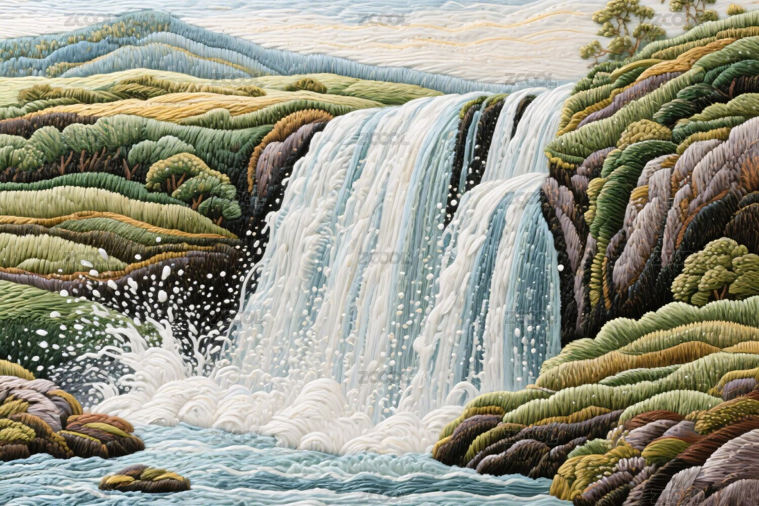 山水,河流,树木,山丘,云朵,风景,自然,田园,插画,彩绘