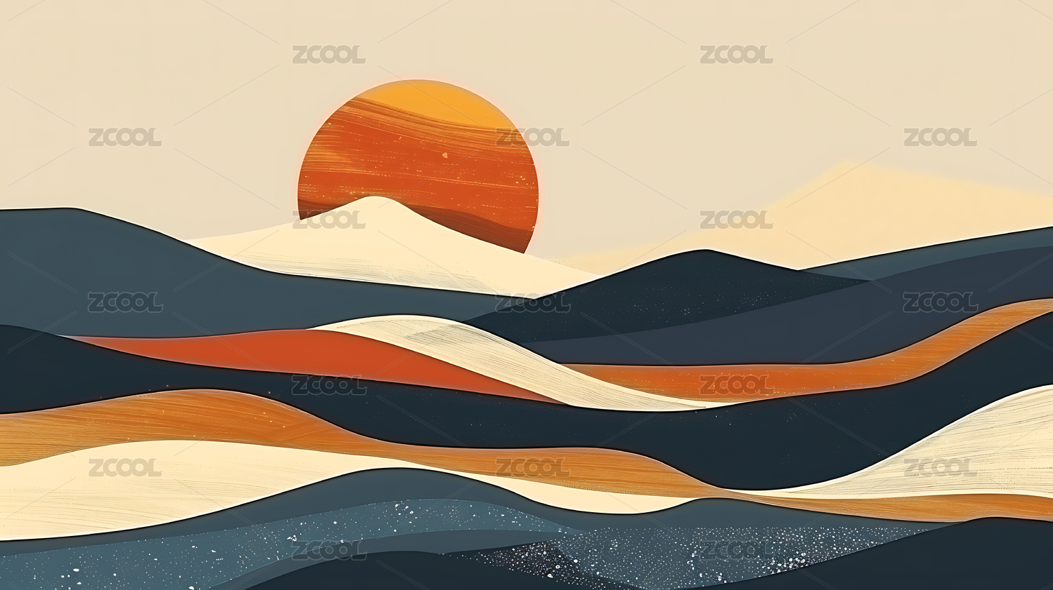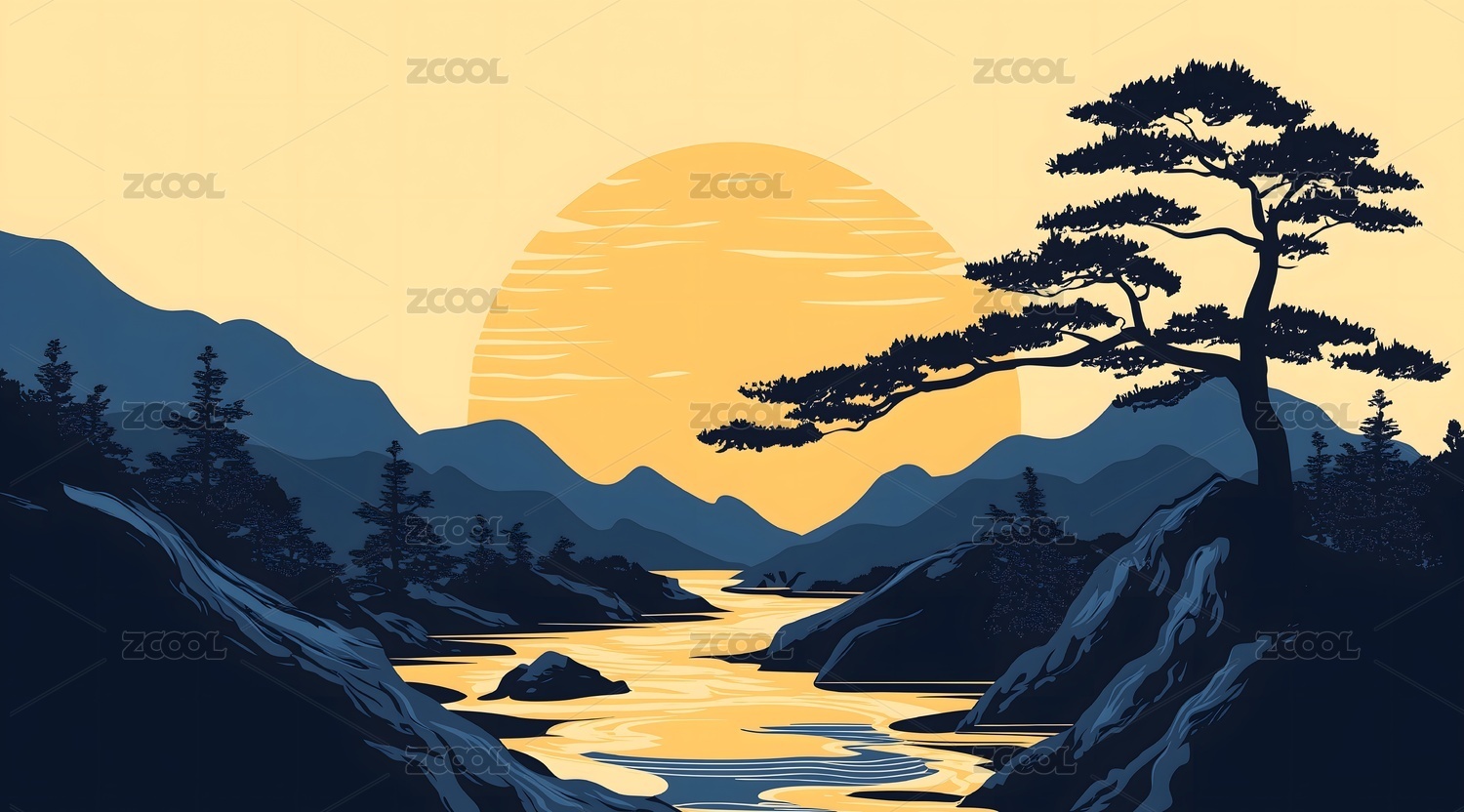 山脉,夕阳,丘陵,河流,树木,插画,背景,自然,平涂,暖色调