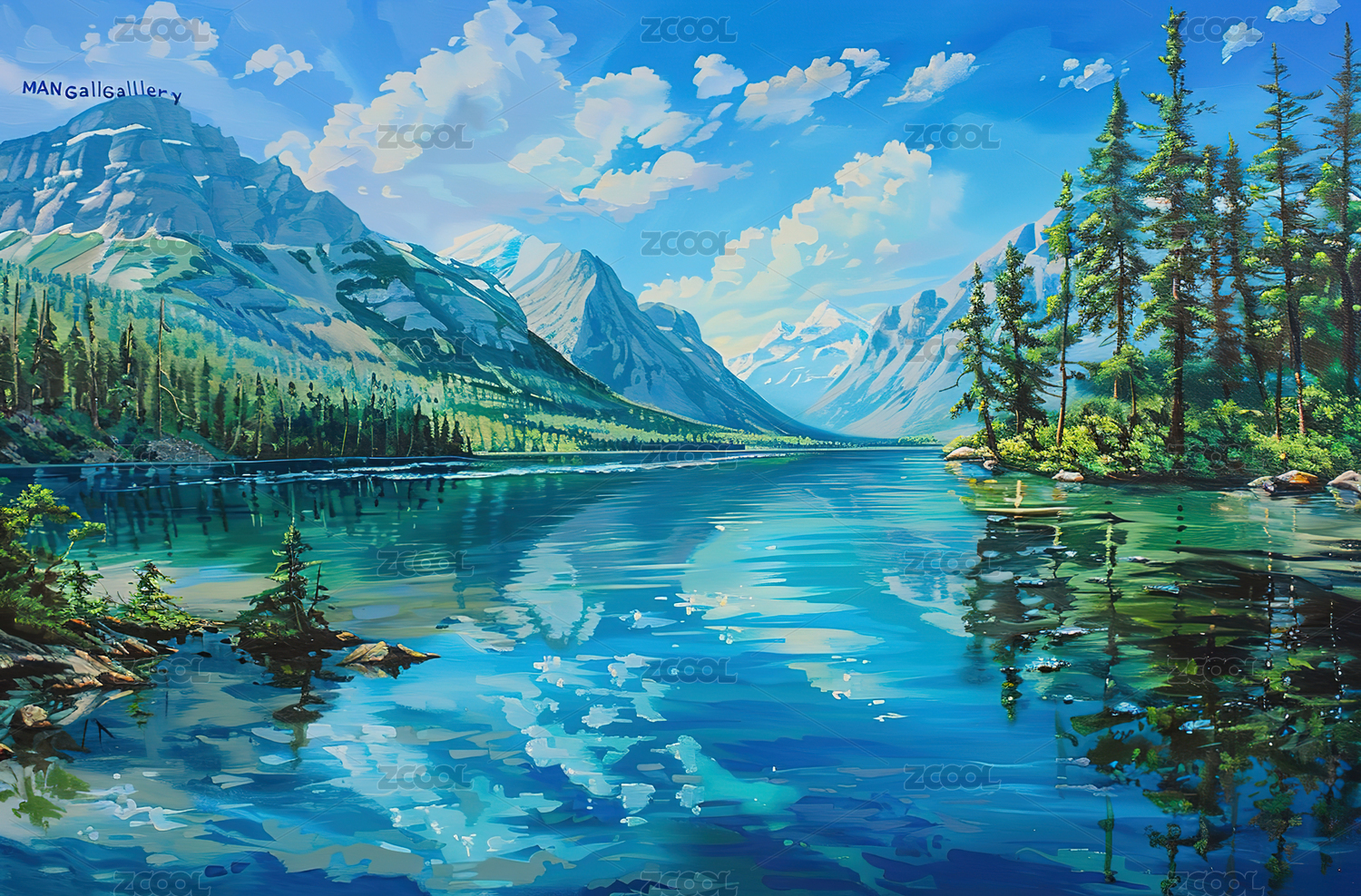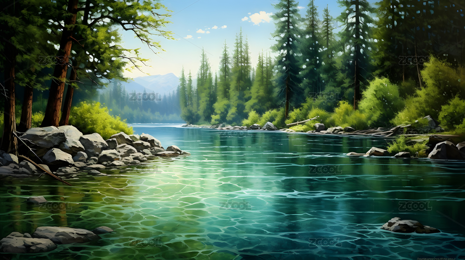 河流,森林,树木,山脉,青山,绿水,自然,风景,风景画,插画