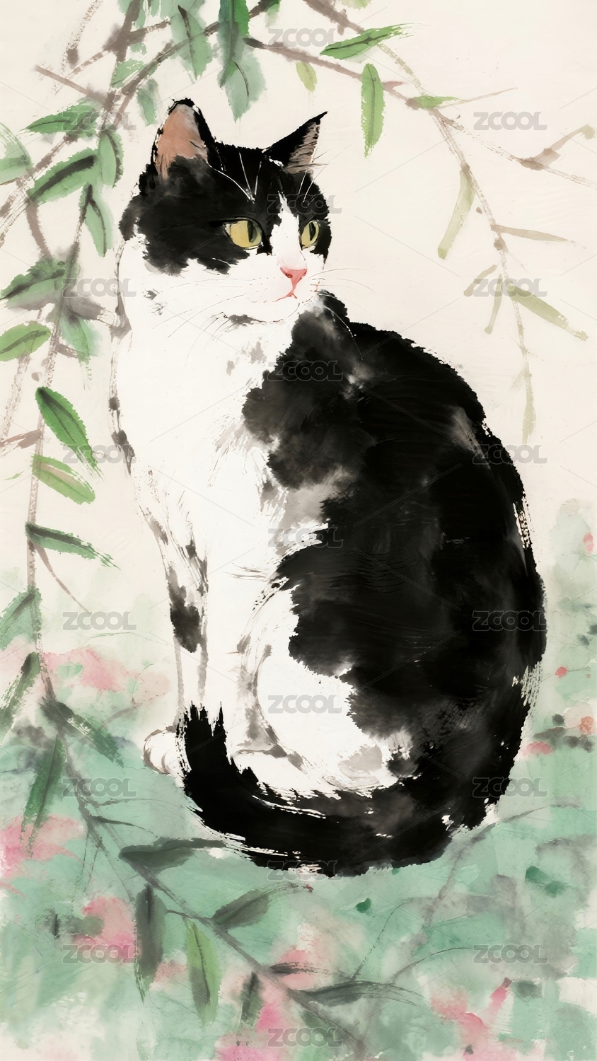 花猫水墨风花枝场景