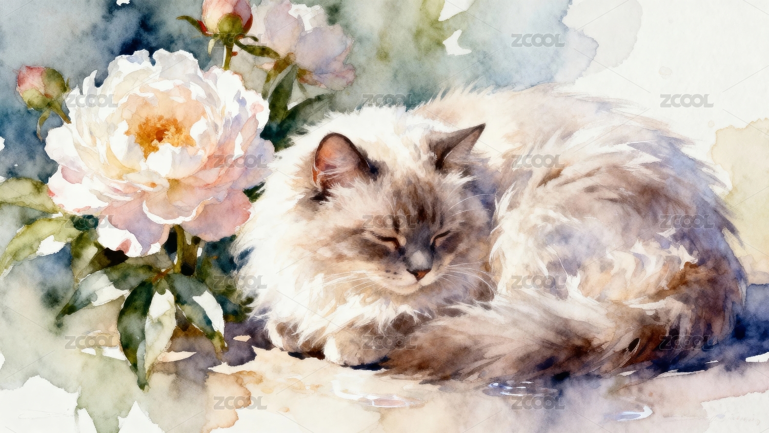 水彩画中的猫咪与玫瑰