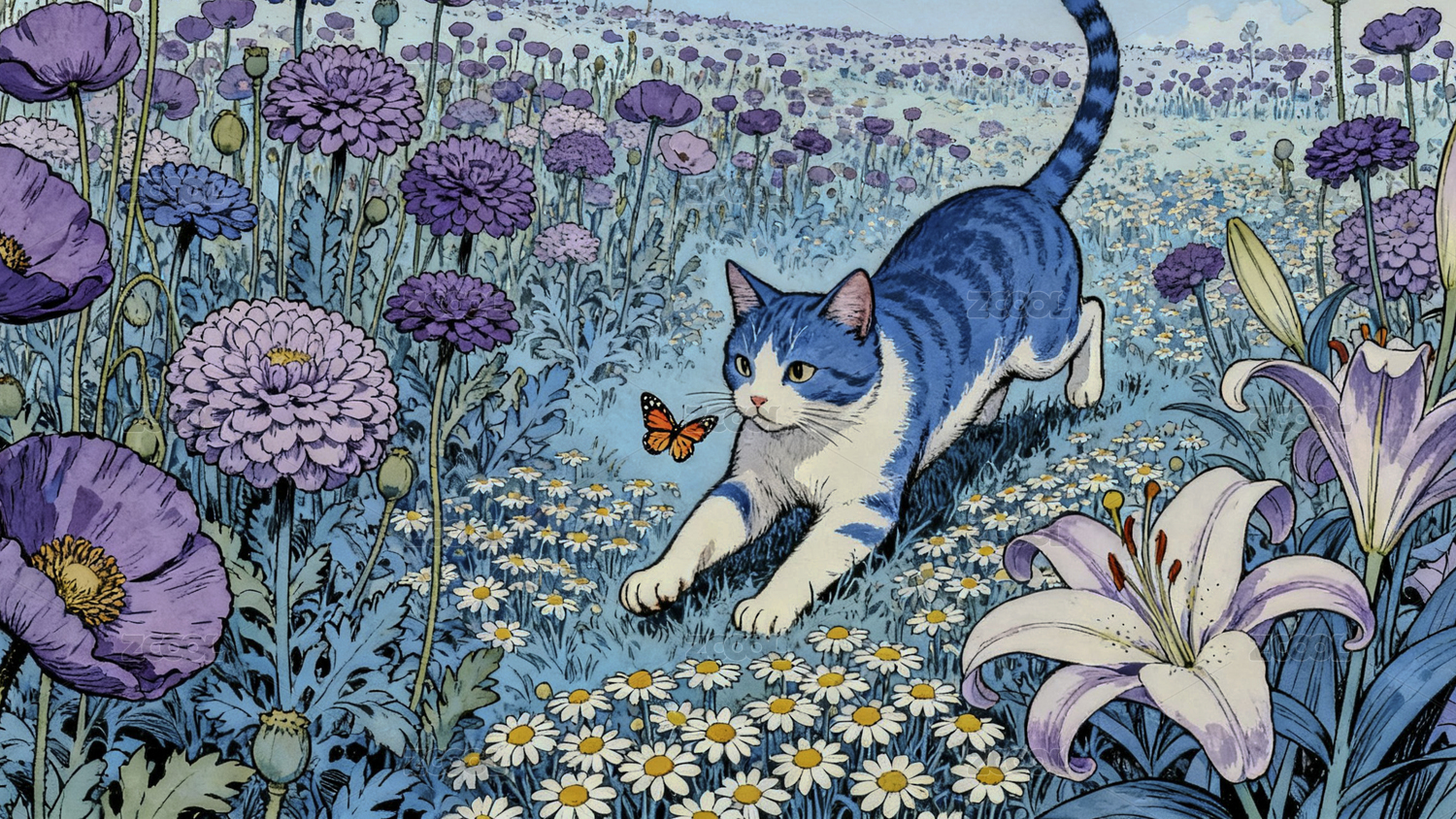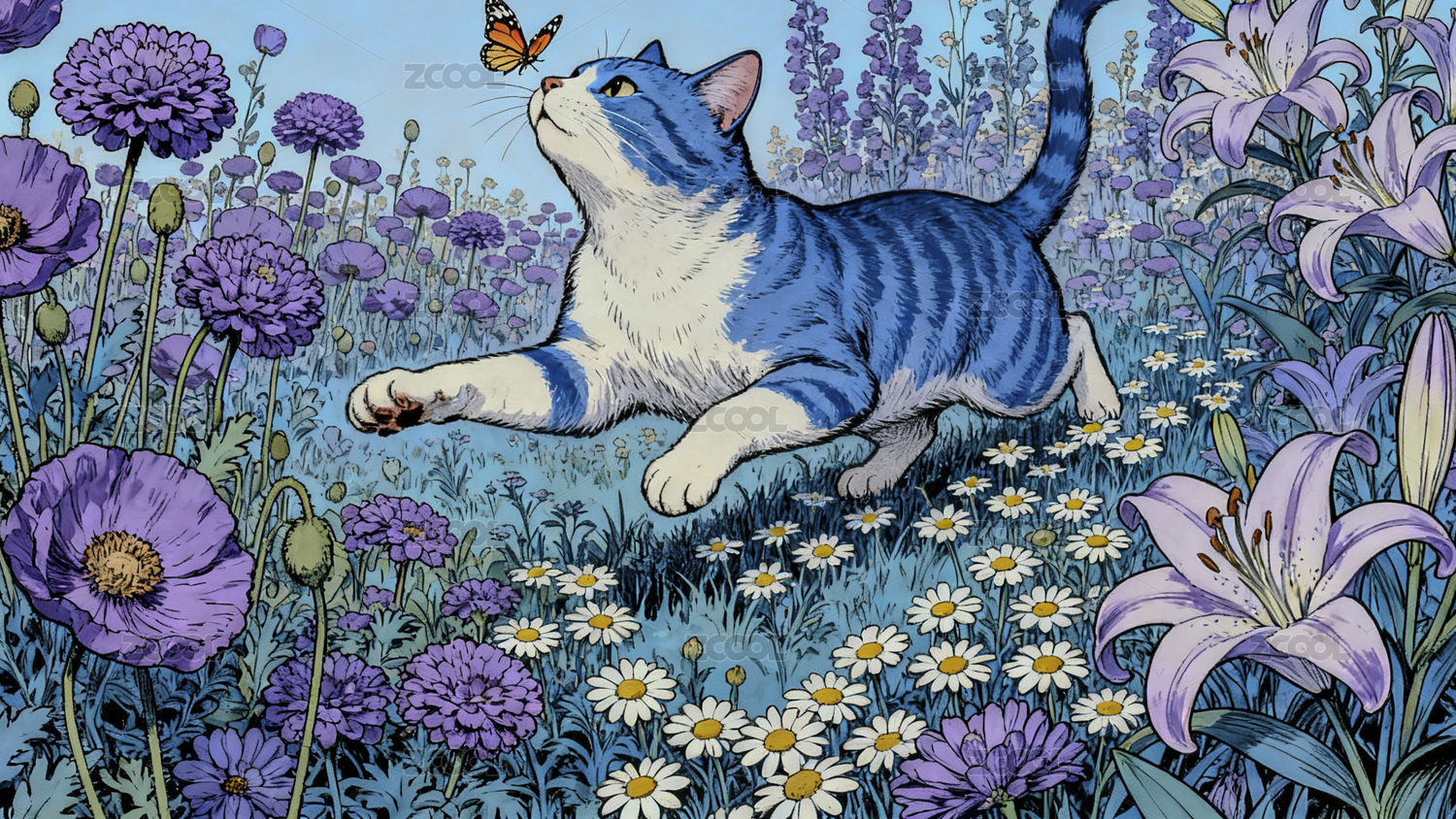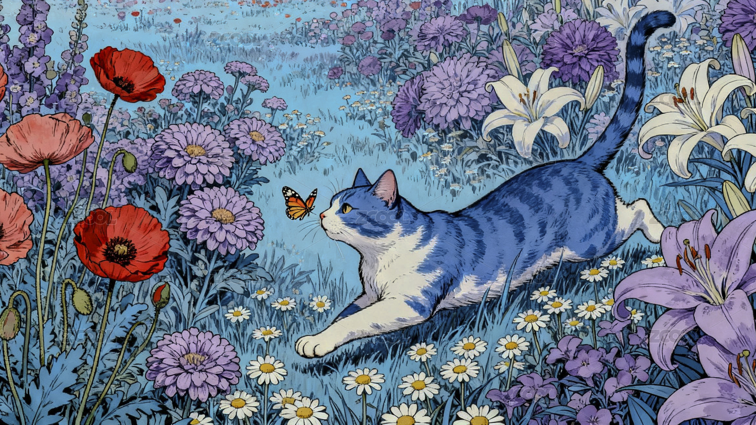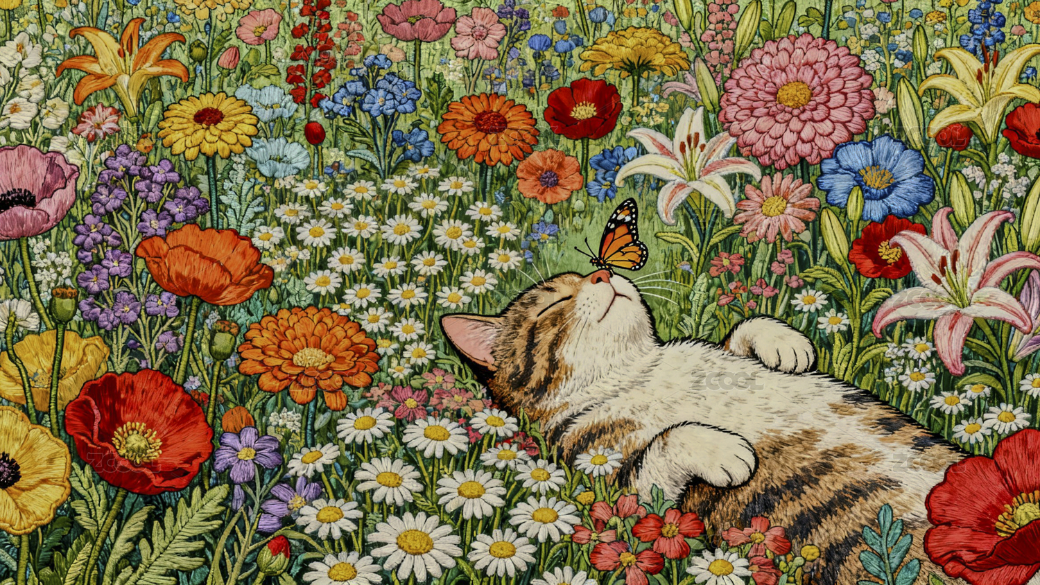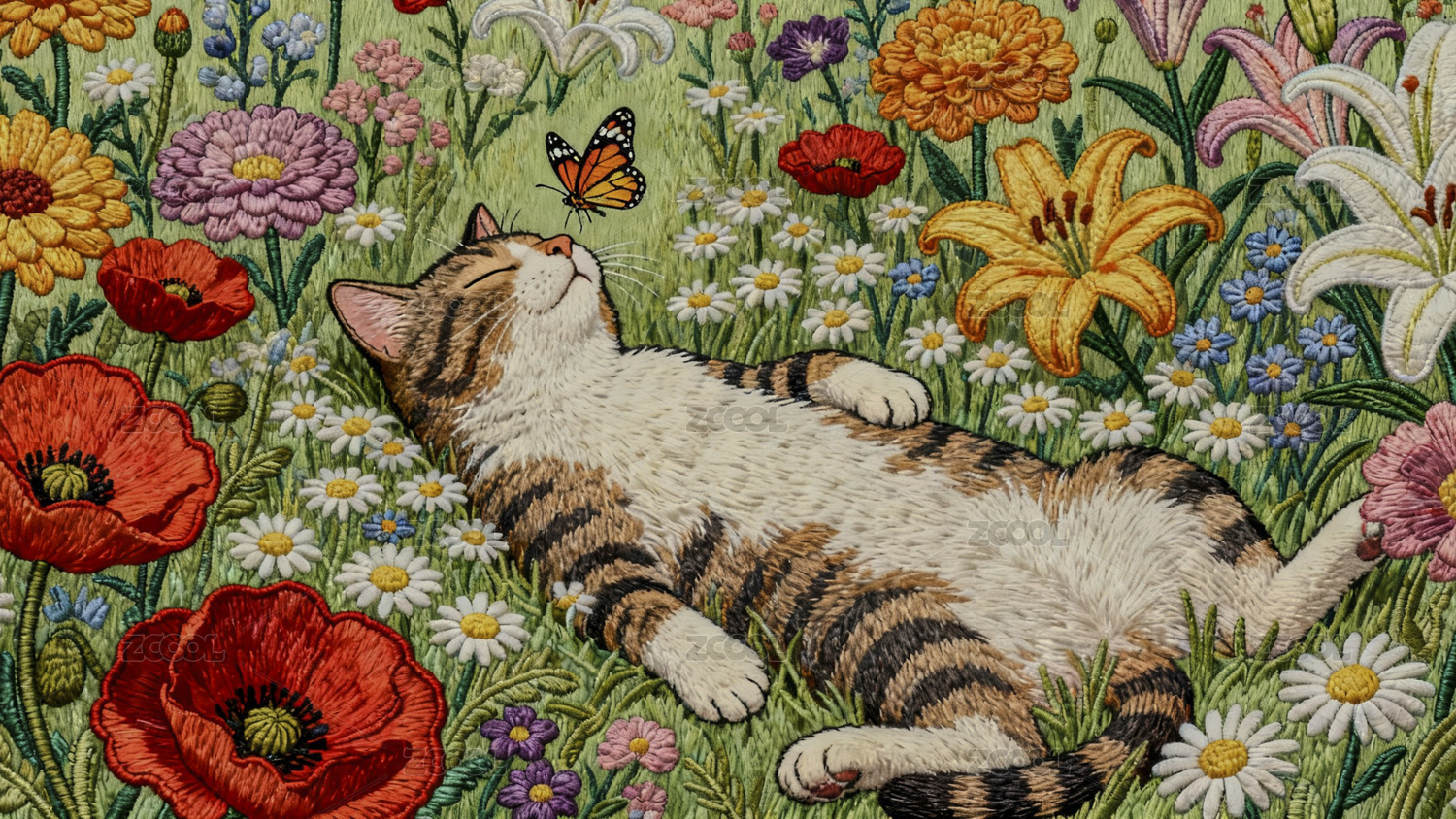 极繁主义繁花丛里酣睡的猫咪刺绣背景