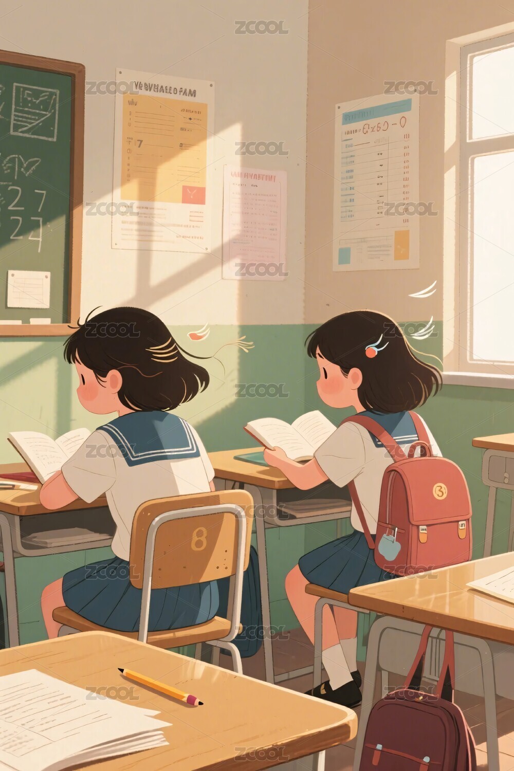 教室读书少女插画