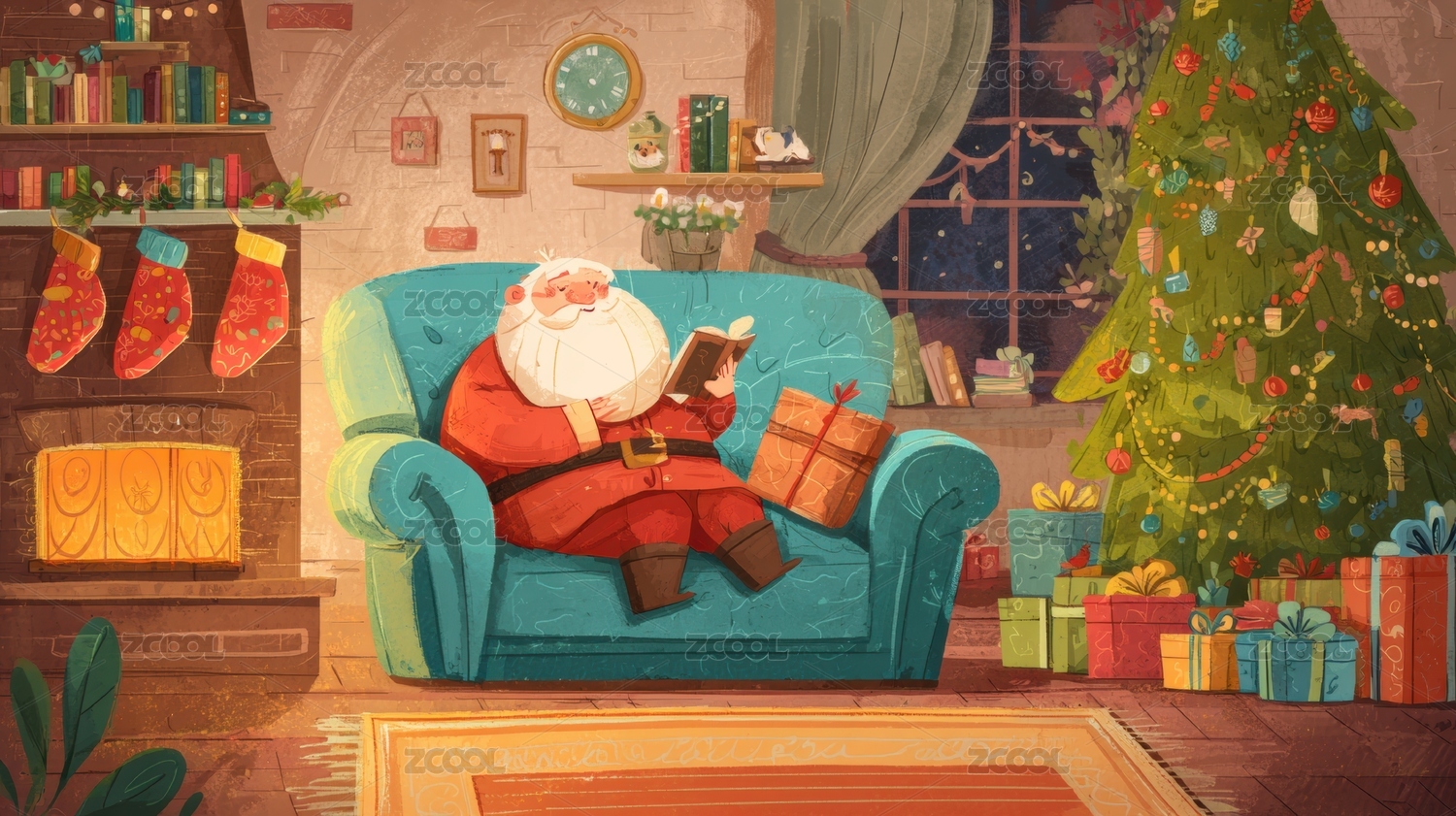圣诞老人在客厅阅读