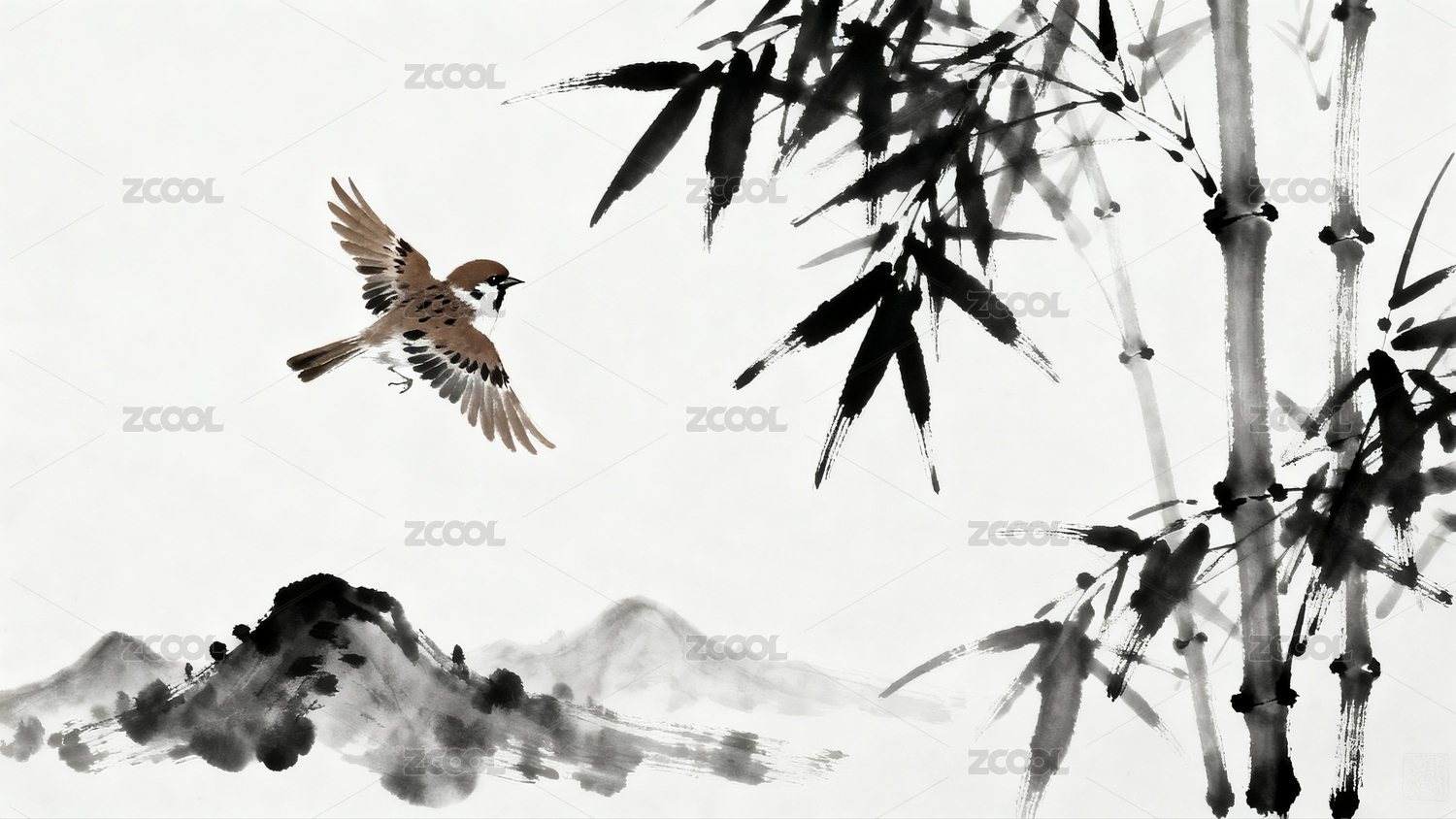 水墨山水飞鸟图