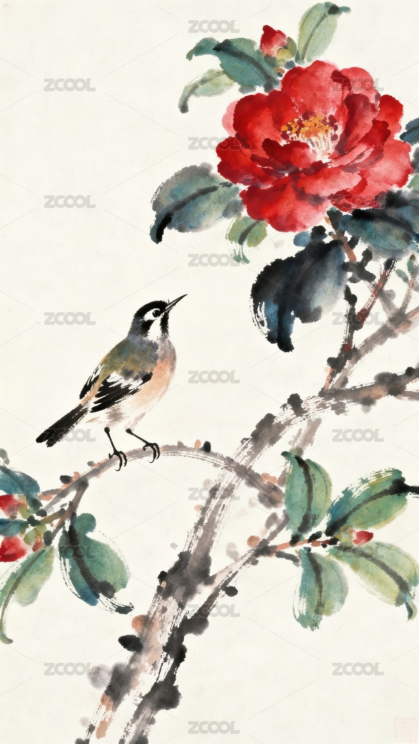 水墨画中的小鸟与花卉