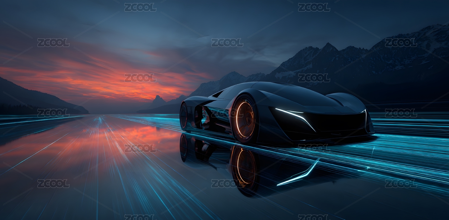 未来跑车公路疾驰夕阳山脉科幻