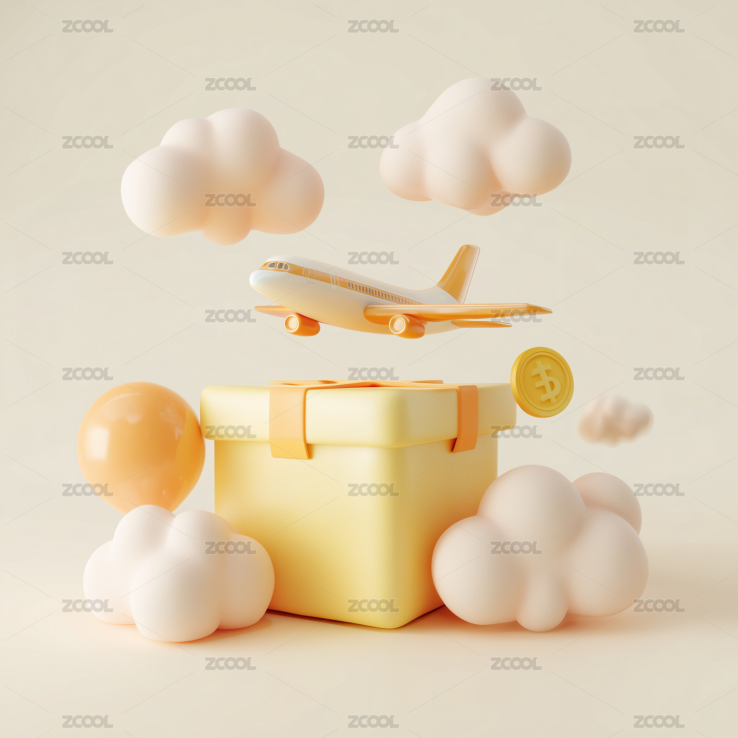 快递盒,飞机,硬币,云朵,黄色,橙色,淡色,柔软,膨胀,形状