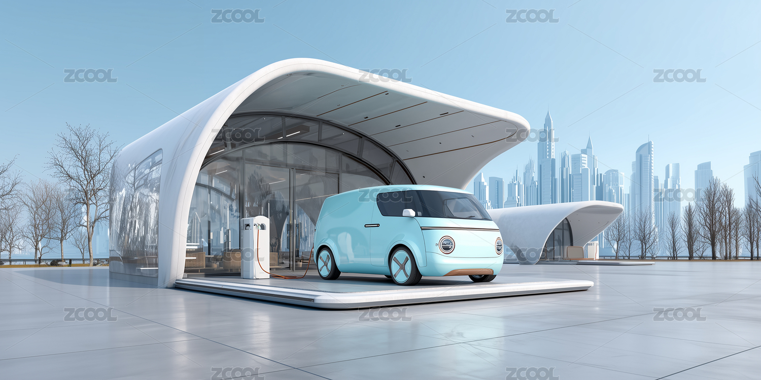 电动,货车,充电,电站,白色,薄荷蓝,色调,未来,城市,背景