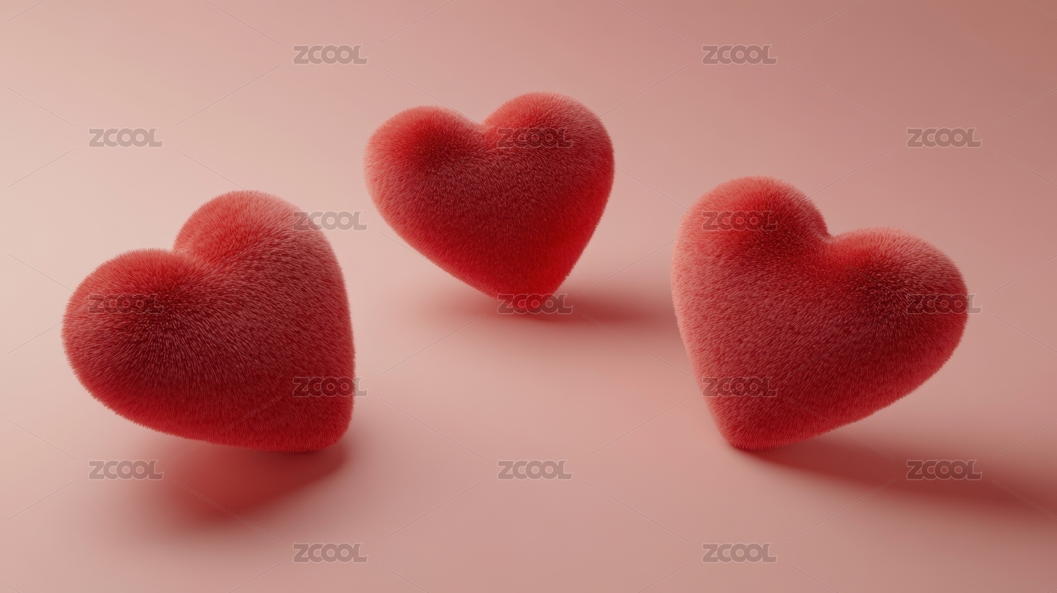 三颗蓬松红色爱心漂浮在米色背景上