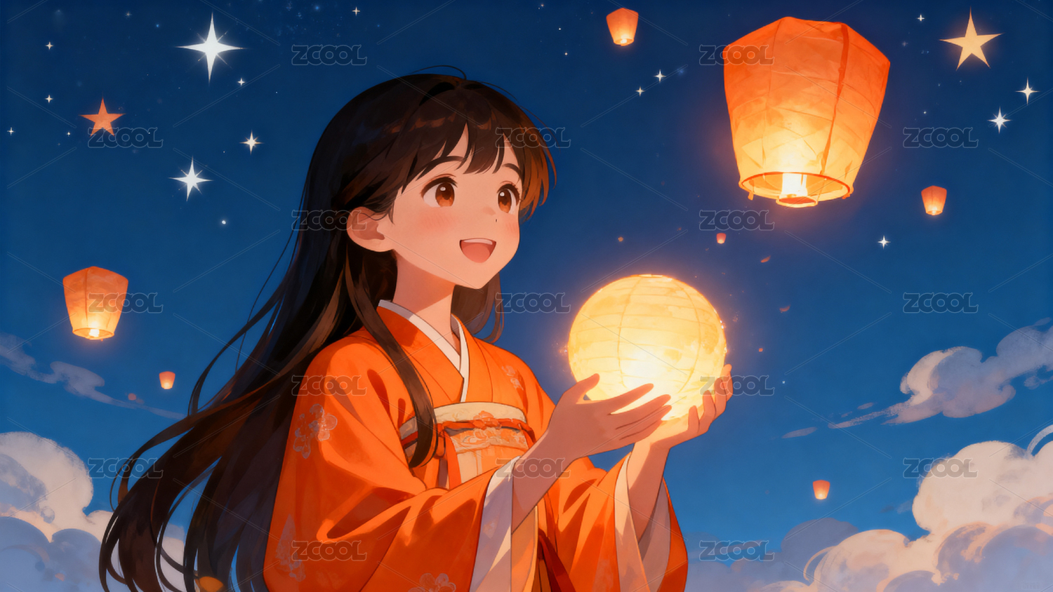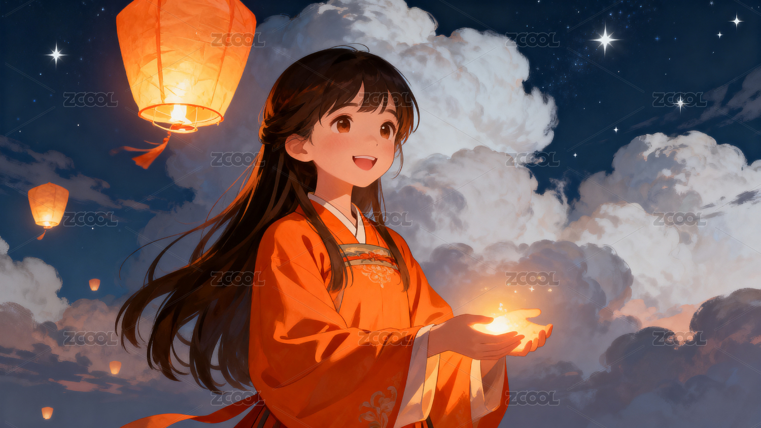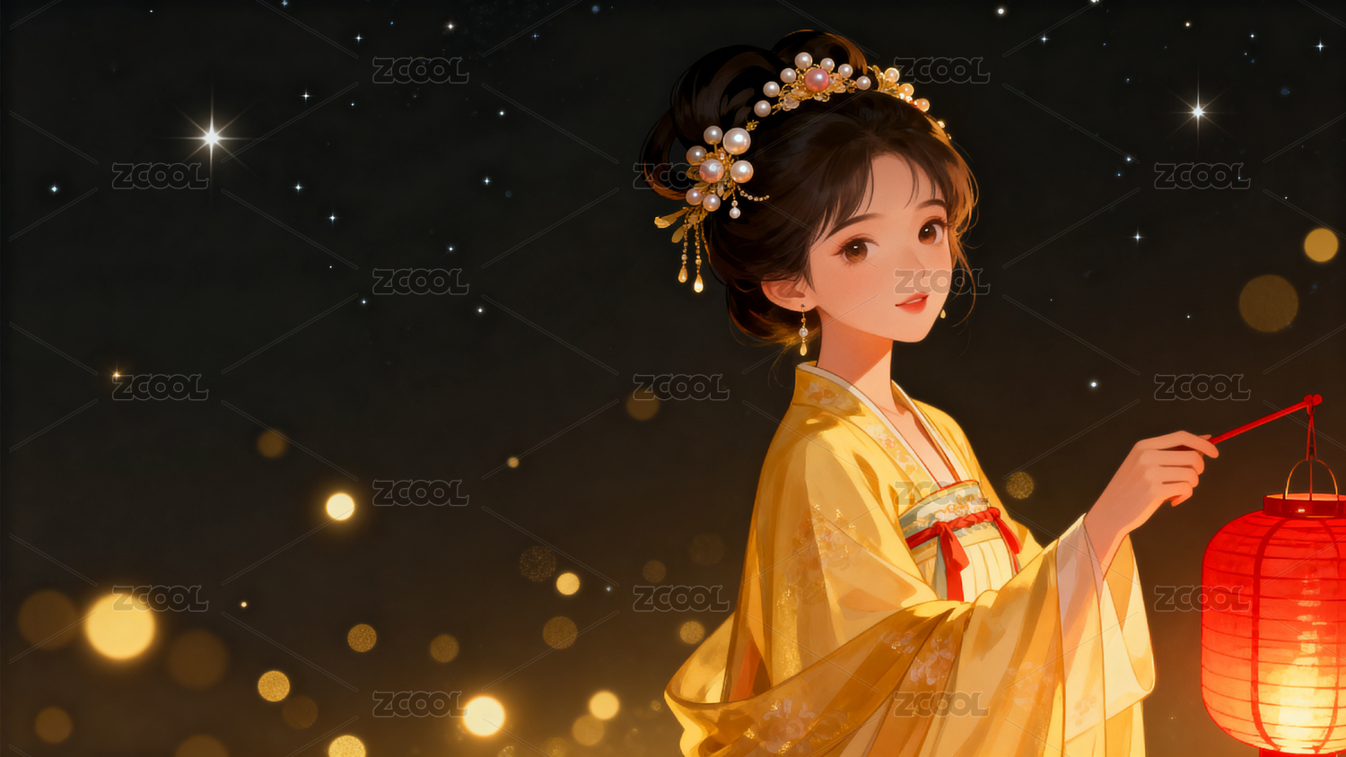 红色,装饰,光芒,点缀,灯笼,女子,古装,头饰,星光,夜空