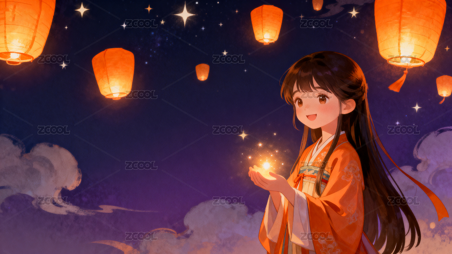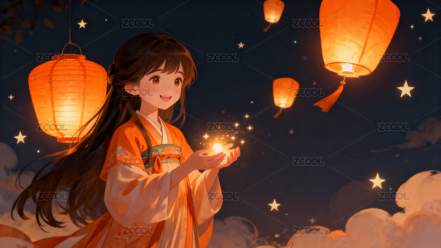 夜空灯笼少女许愿