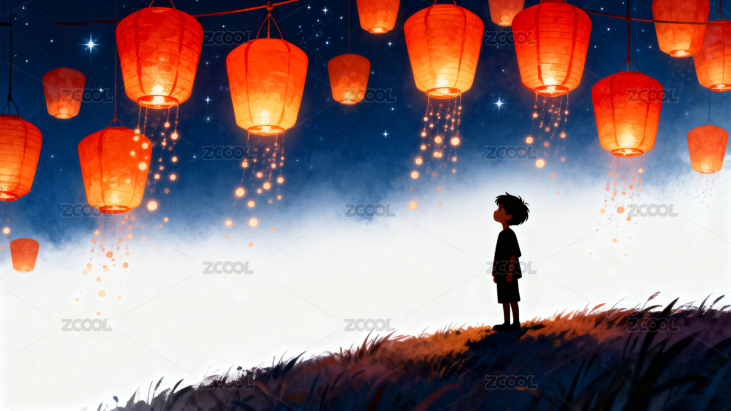 夜空灯笼男孩仰望梦幻场景