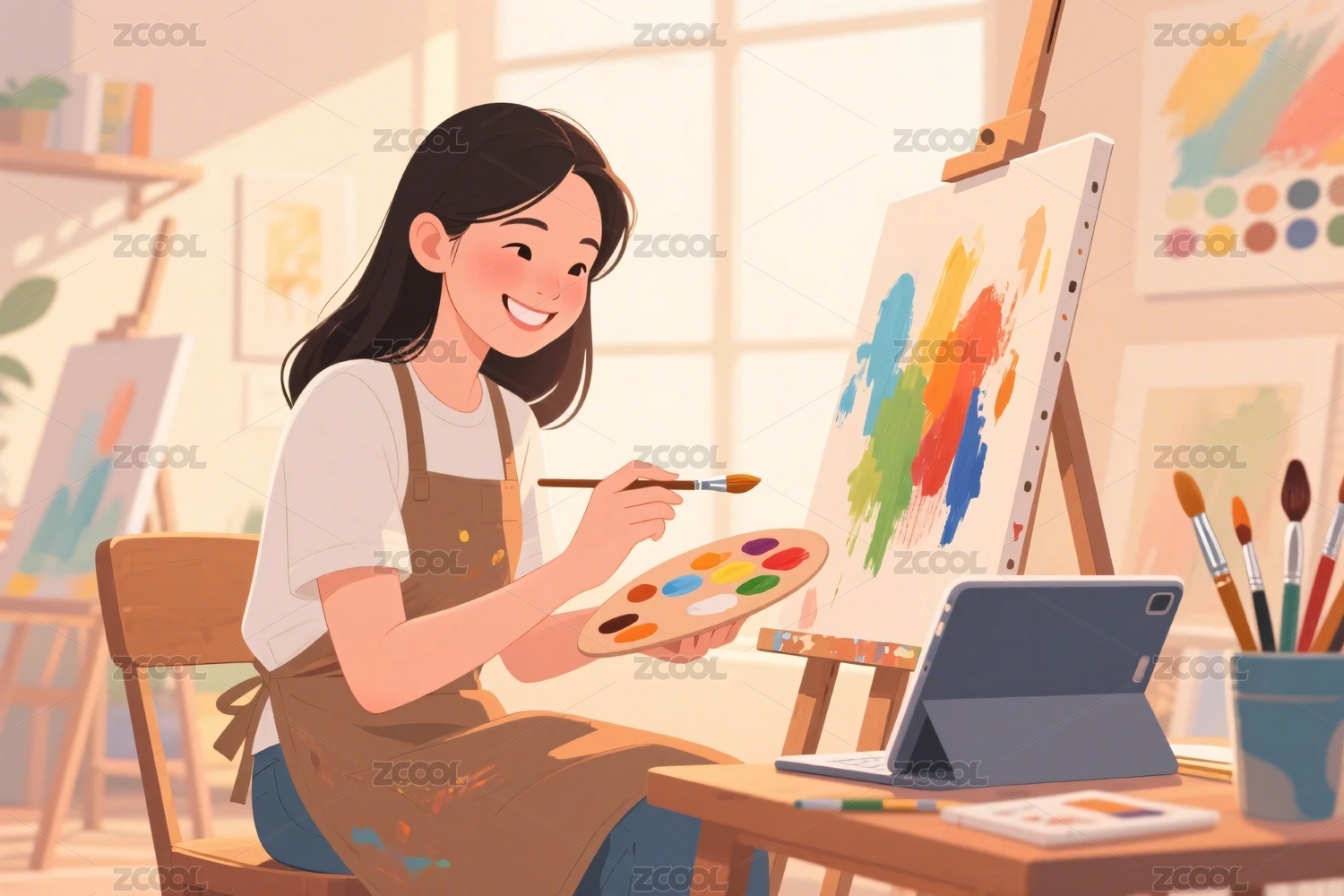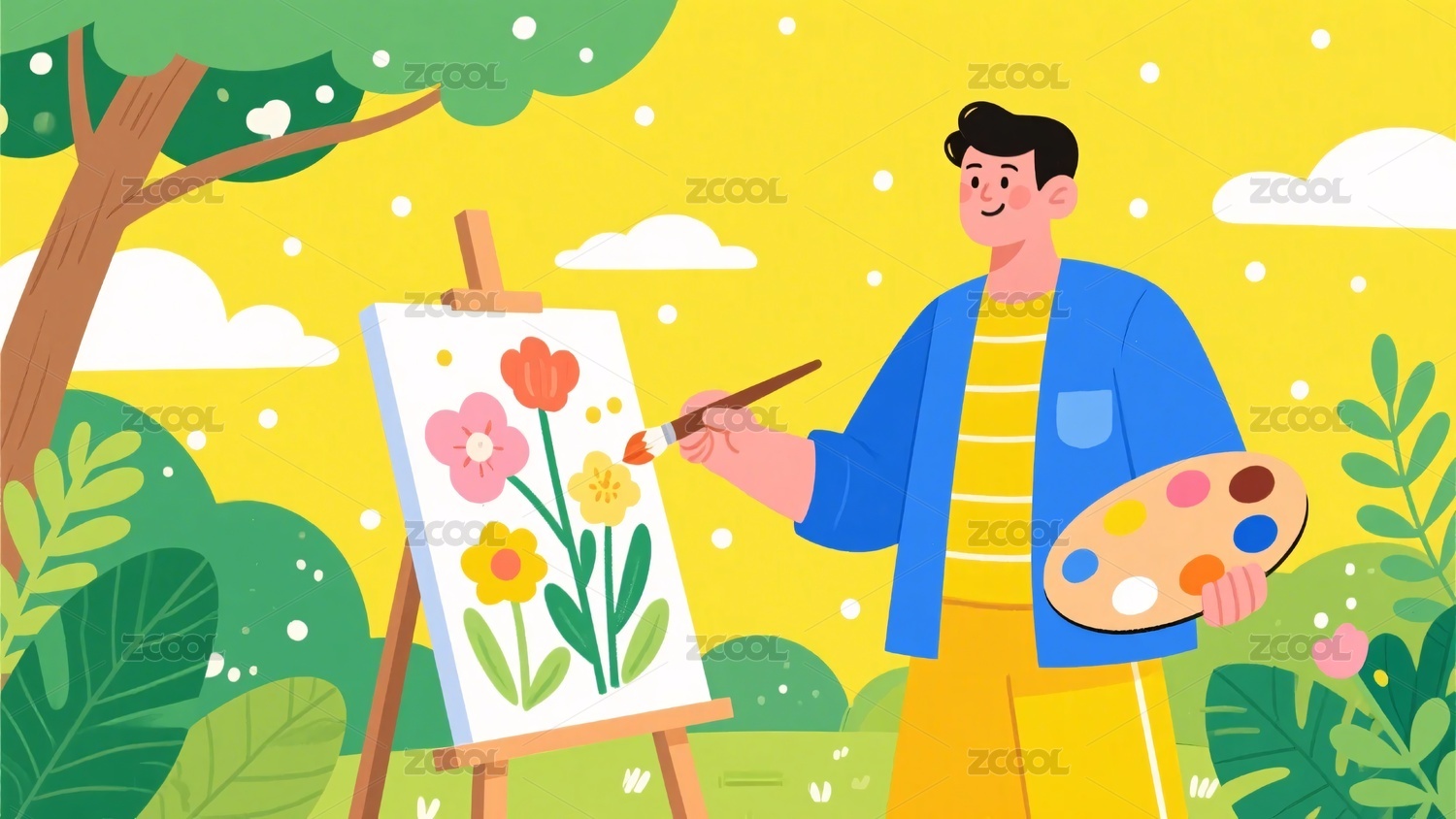 艺术,室内,色彩,蓝天,绘画,云朵,风景,可爱,微笑,树木