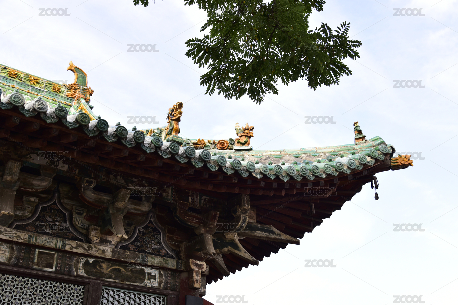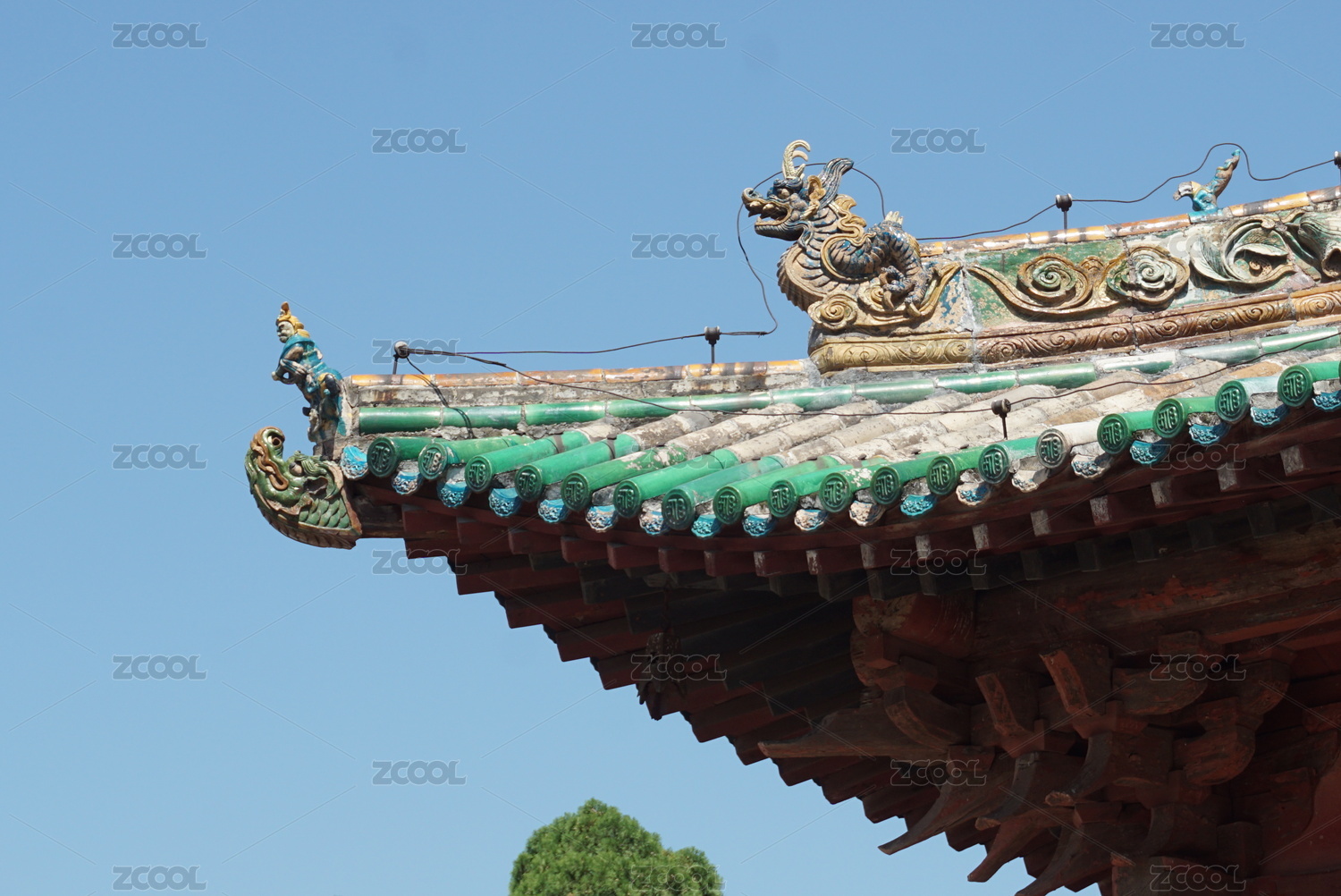 古代建筑屋脊雕塑琉璃,天空背景历史文物屋