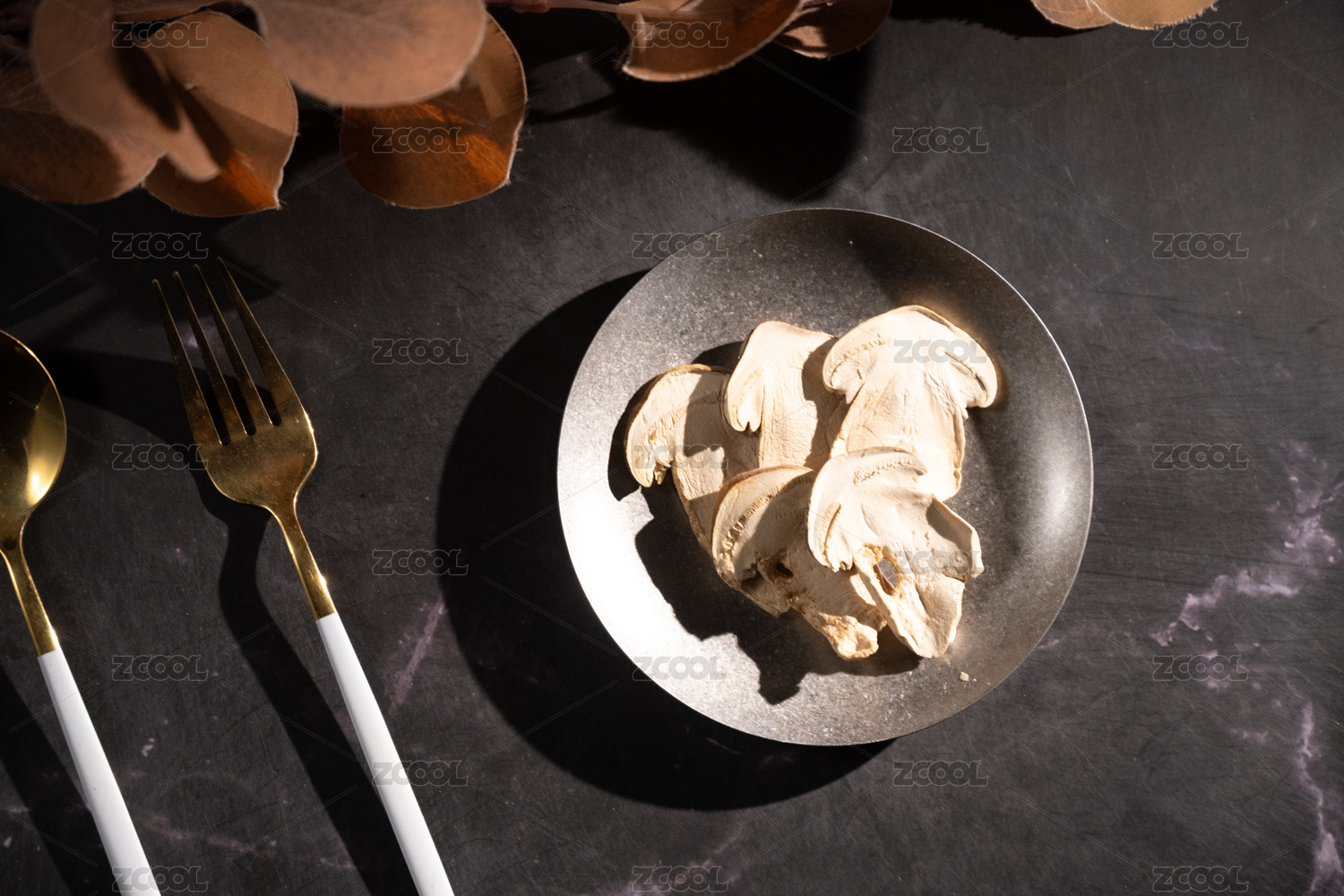桌面上的盘子里的美味可口的干松茸