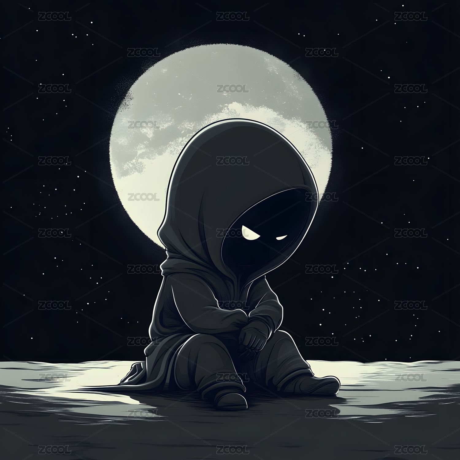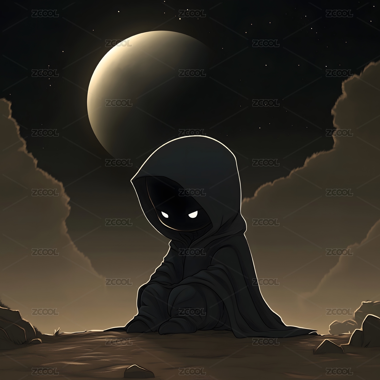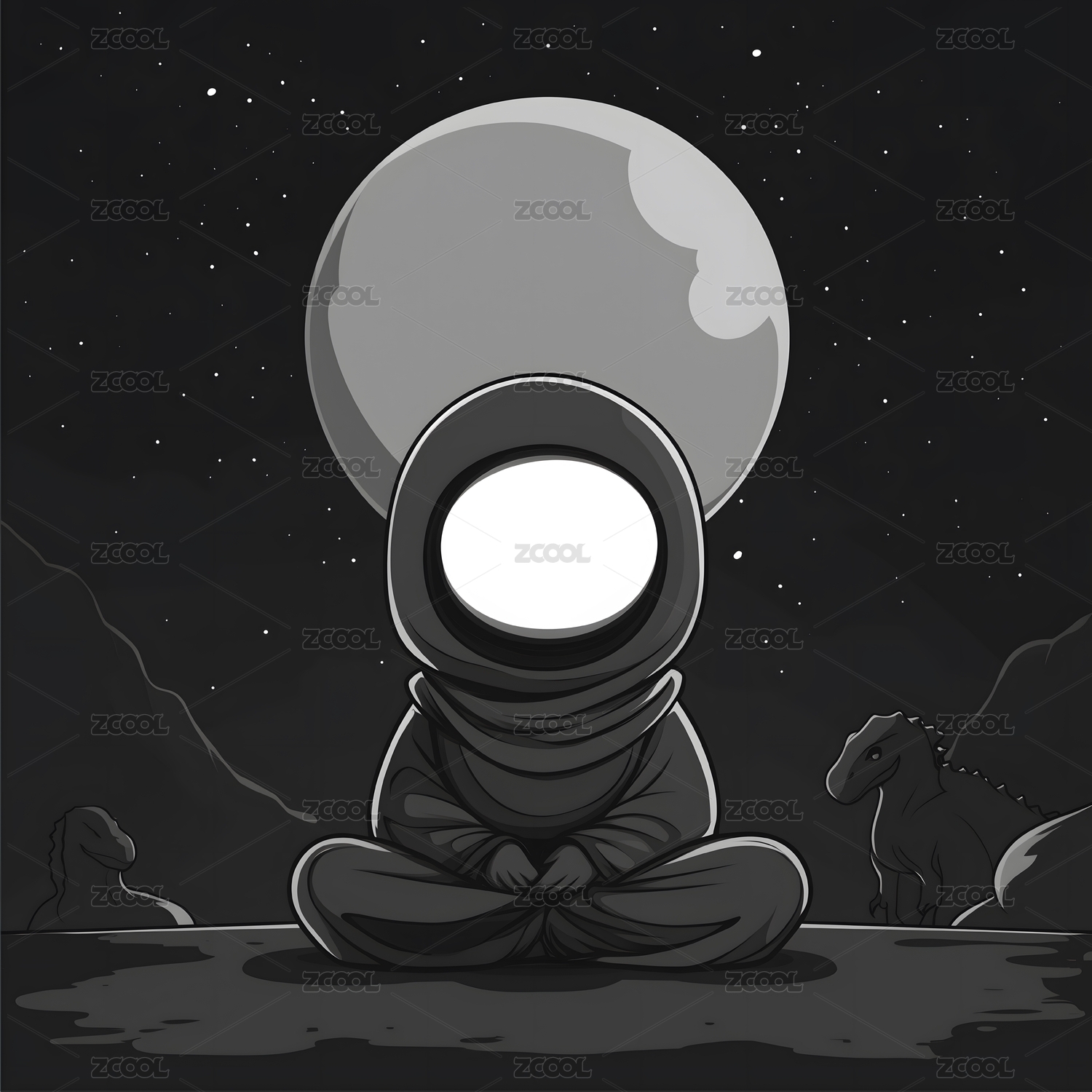 月夜下圆头角色打坐显静谧神秘