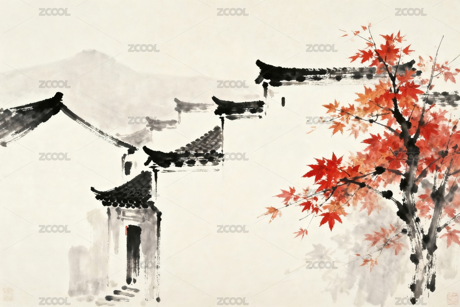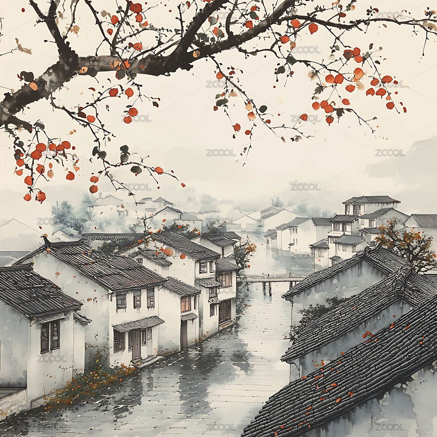 白墙,水墨,房屋,建筑,树木,屋顶,柿子,果实,绿叶,枝干