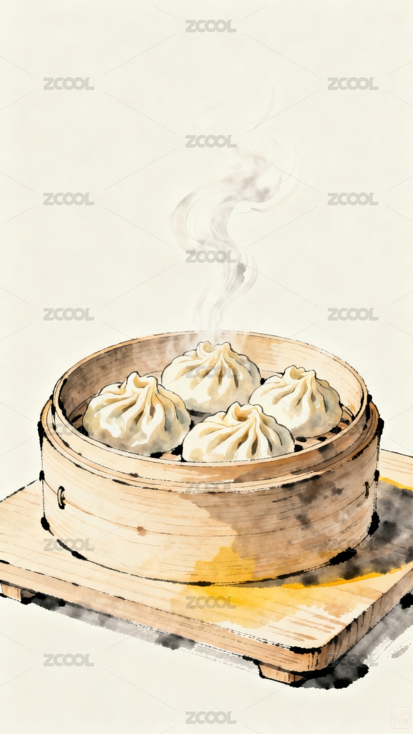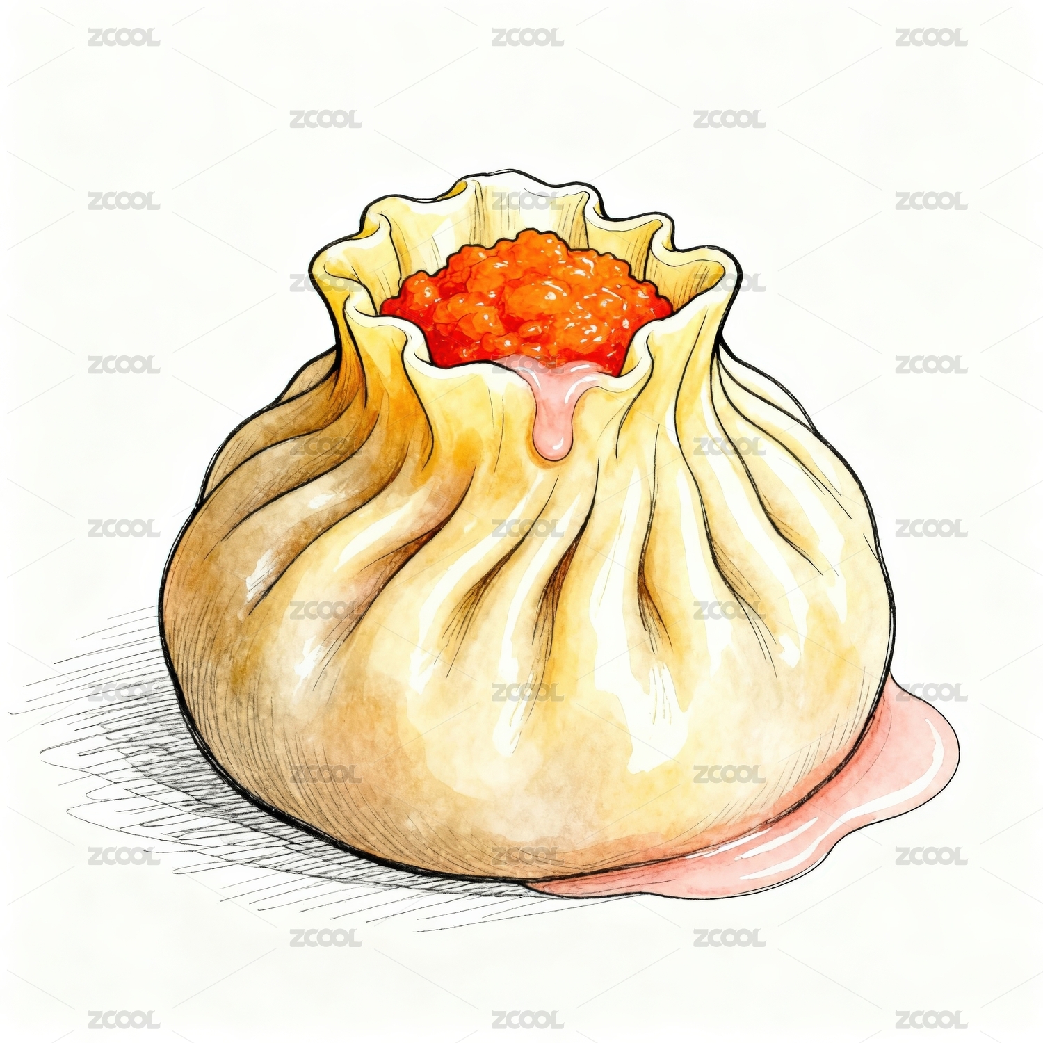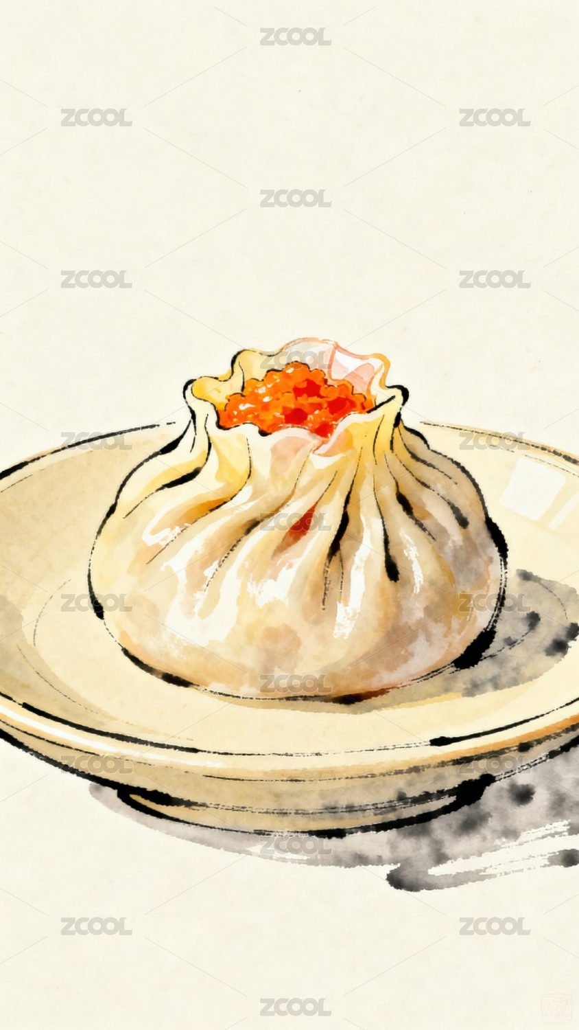 食物,盘子,传统,水墨,绘画,水彩,包子,灌汤包,馅料,面皮