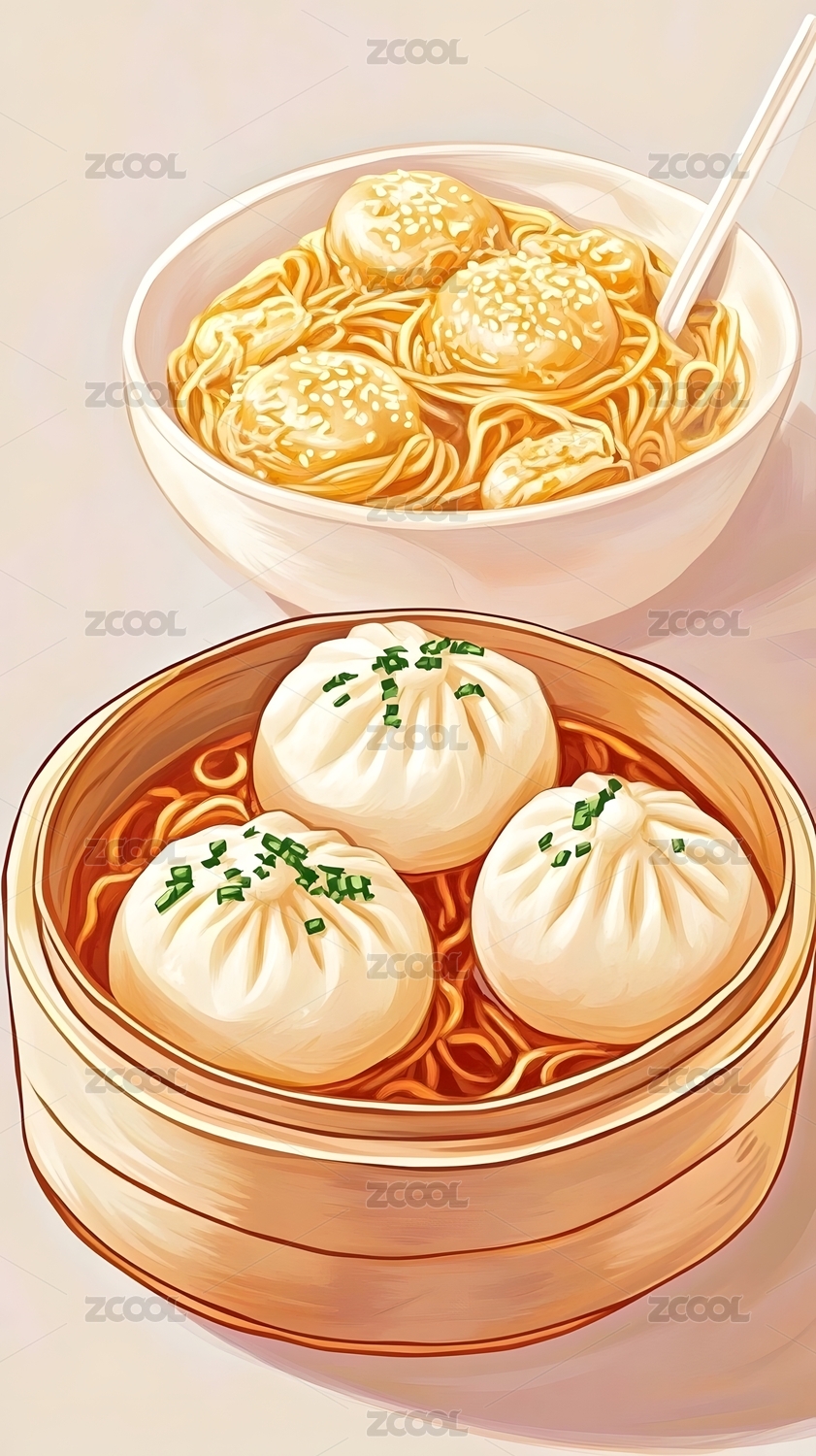 手绘美食之早茶点心叉烧包鲜肉包包子插画