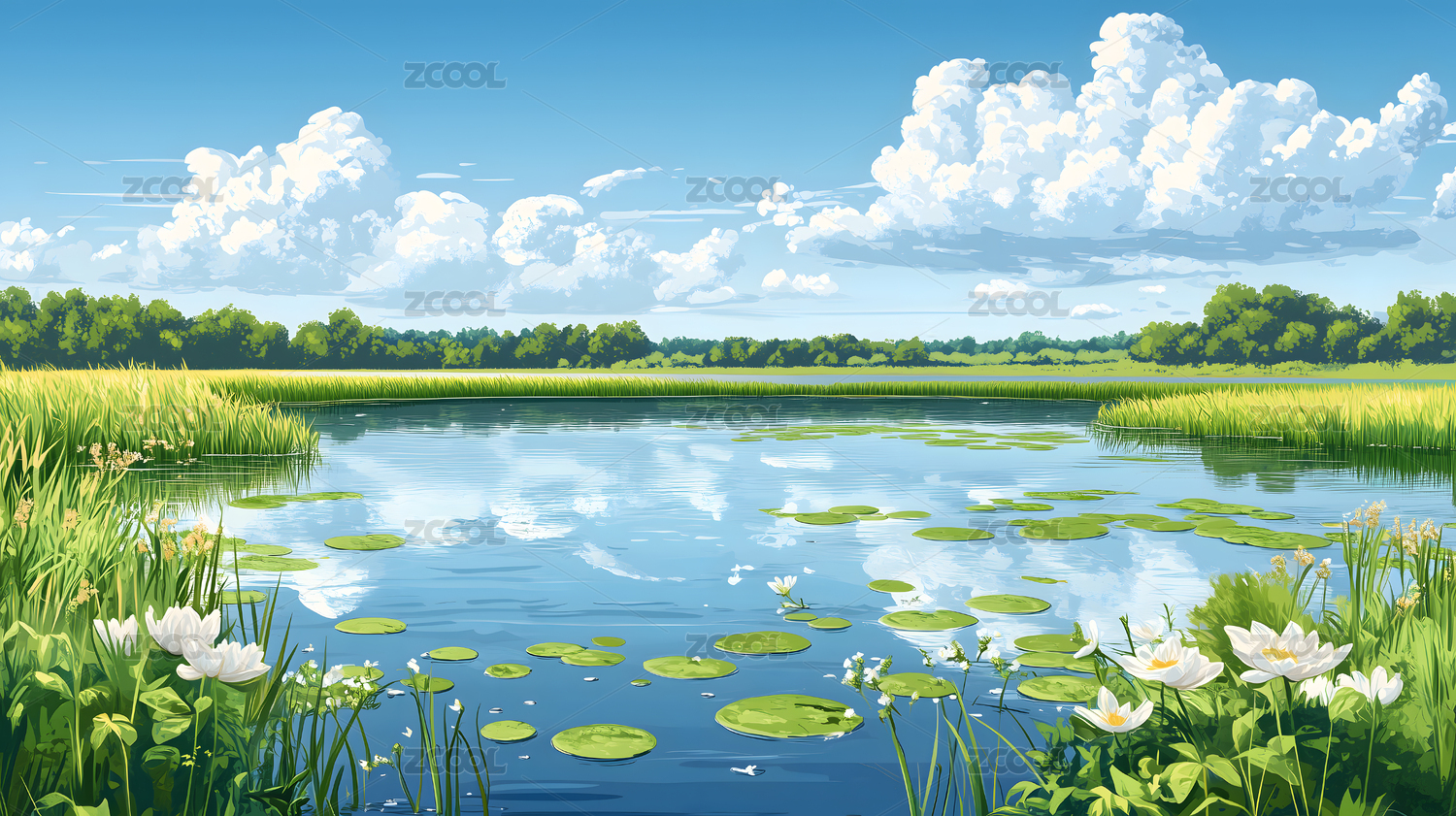 风景,湖泊,树木,草地,夏季,天空,云朵,宁静,绿色,森林
